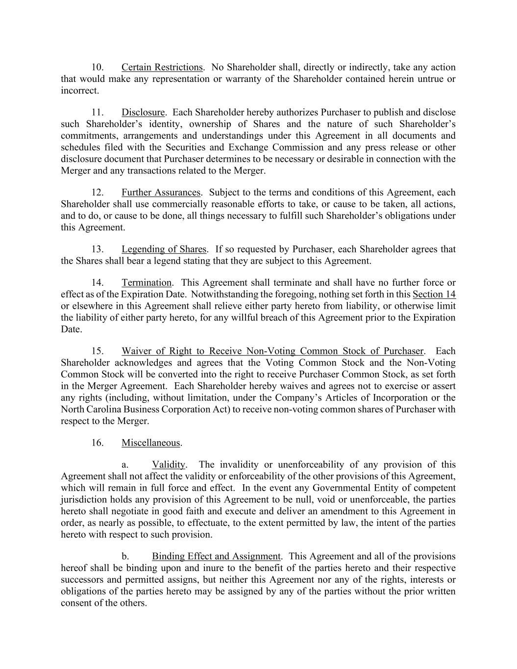 10. Certain Restrictions. No Shareholder shall, directly or indirectly, take any action that would make any representation or warranty of the Shareholder contained herein untrue or incorrect. 11. Disclosure. Each Shareholder hereby authorizes Purchaser to publish and disclose such Shareholder’s identity, ownership of Shares and the nature of such Shareholder’s commitments, arrangements and understandings under this Agreement in all documents and schedules filed with the Securities and Exchange Commission and any press release or other disclosure document that Purchaser determines to be necessary or desirable in connection with the Merger and any transactions related to the Merger. 12. Further Assurances. Subject to the terms and conditions of this Agreement, each Shareholder shall use commercially reasonable efforts to take, or cause to be taken, all actions, and to do, or cause to be done, all things necessary to fulfill such Shareholder’s obligations under this Agreement. 13. Legending of Shares. If so requested by Purchaser, each Shareholder agrees that the Shares shall bear a legend stating that they are subject to this Agreement. 14. Termination. This Agreement shall terminate and shall have no further force or effect as of the Expiration Date. Notwithstanding the foregoing, nothing set forth in this Section 14 or elsewhere in this Agreement shall relieve either party hereto from liability, or otherwise limit the liability of either party hereto, for any willful breach of this Agreement prior to the Expiration Date. 15. Waiver of Right to Receive Non-Voting Common Stock of Purchaser. Each Shareholder acknowledges and agrees that the Voting Common Stock and the Non-Voting Common Stock will be converted into the right to receive Purchaser Common Stock, as set forth in the Merger Agreement. Each Shareholder hereby waives and agrees not to exercise or assert any rights (including, without limitation, under the Company’s Articles of Incorporation or the North Carolina Business Corporation Act) to receive non-voting common shares of Purchaser with respect to the Merger. 16. Miscellaneous. a. Validity. The invalidity or unenforceability of any provision of this Agreement shall not affect the validity or enforceability of the other provisions of this Agreement, which will remain in full force and effect. In the event any Governmental Entity of competent jurisdiction holds any provision of this Agreement to be null, void or unenforceable, the parties hereto shall negotiate in good faith and execute and deliver an amendment to this Agreement in order, as nearly as possible, to effectuate, to the extent permitted by law, the intent of the parties hereto with respect to such provision. b. Binding Effect and Assignment. This Agreement and all of the provisions hereof shall be binding upon and inure to the benefit of the parties hereto and their respective successors and permitted assigns, but neither this Agreement nor any of the rights, interests or obligations of the parties hereto may be assigned by any of the parties without the prior written consent of the others.