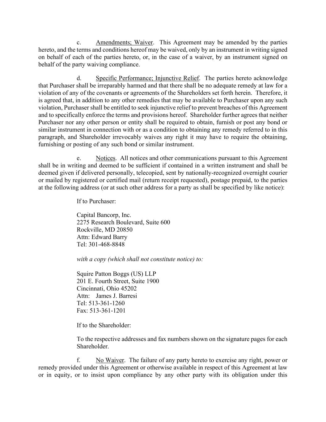 c. Amendments; Waiver. This Agreement may be amended by the parties hereto, and the terms and conditions hereof may be waived, only by an instrument in writing signed on behalf of each of the parties hereto, or, in the case of a waiver, by an instrument signed on behalf of the party waiving compliance. d. Specific Performance; Injunctive Relief. The parties hereto acknowledge that Purchaser shall be irreparably harmed and that there shall be no adequate remedy at law for a violation of any of the covenants or agreements of the Shareholders set forth herein. Therefore, it is agreed that, in addition to any other remedies that may be available to Purchaser upon any such violation, Purchaser shall be entitled to seek injunctive relief to prevent breaches of this Agreement and to specifically enforce the terms and provisions hereof. Shareholder further agrees that neither Purchaser nor any other person or entity shall be required to obtain, furnish or post any bond or similar instrument in connection with or as a condition to obtaining any remedy referred to in this paragraph, and Shareholder irrevocably waives any right it may have to require the obtaining, furnishing or posting of any such bond or similar instrument. e. Notices. All notices and other communications pursuant to this Agreement shall be in writing and deemed to be sufficient if contained in a written instrument and shall be deemed given if delivered personally, telecopied, sent by nationally-recognized overnight courier or mailed by registered or certified mail (return receipt requested), postage prepaid, to the parties at the following address (or at such other address for a party as shall be specified by like notice): If to Purchaser: Capital Bancorp, Inc. 2275 Research Boulevard, Suite 600 Rockville, MD 20850 Attn: Edward Barry Tel: 301-468-8848 with a copy (which shall not constitute notice) to: Squire Patton Boggs (US) LLP 201 E. Fourth Street, Suite 1900 Cincinnati, Ohio 45202 Attn: James J. Barresi Tel: 513-361-1260 Fax: 513-361-1201 If to the Shareholder: To the respective addresses and fax numbers shown on the signature pages for each Shareholder. f. No Waiver. The failure of any party hereto to exercise any right, power or remedy provided under this Agreement or otherwise available in respect of this Agreement at law or in equity, or to insist upon compliance by any other party with its obligation under this