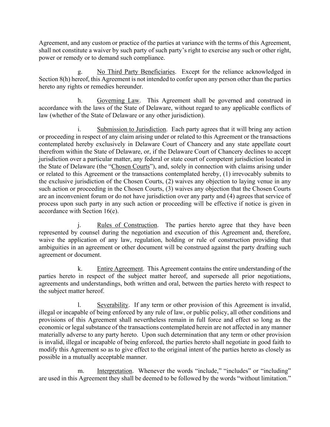 Agreement, and any custom or practice of the parties at variance with the terms of this Agreement, shall not constitute a waiver by such party of such party’s right to exercise any such or other right, power or remedy or to demand such compliance. g. No Third Party Beneficiaries. Except for the reliance acknowledged in Section 8(h) hereof, this Agreement is not intended to confer upon any person other than the parties hereto any rights or remedies hereunder. h. Governing Law. This Agreement shall be governed and construed in accordance with the laws of the State of Delaware, without regard to any applicable conflicts of law (whether of the State of Delaware or any other jurisdiction). i. Submission to Jurisdiction. Each party agrees that it will bring any action or proceeding in respect of any claim arising under or related to this Agreement or the transactions contemplated hereby exclusively in Delaware Court of Chancery and any state appellate court therefrom within the State of Delaware, or, if the Delaware Court of Chancery declines to accept jurisdiction over a particular matter, any federal or state court of competent jurisdiction located in the State of Delaware (the “Chosen Courts”), and, solely in connection with claims arising under or related to this Agreement or the transactions contemplated hereby, (1) irrevocably submits to the exclusive jurisdiction of the Chosen Courts, (2) waives any objection to laying venue in any such action or proceeding in the Chosen Courts, (3) waives any objection that the Chosen Courts are an inconvenient forum or do not have jurisdiction over any party and (4) agrees that service of process upon such party in any such action or proceeding will be effective if notice is given in accordance with Section 16(e). j. Rules of Construction. The parties hereto agree that they have been represented by counsel during the negotiation and execution of this Agreement and, therefore, waive the application of any law, regulation, holding or rule of construction providing that ambiguities in an agreement or other document will be construed against the party drafting such agreement or document. k. Entire Agreement. This Agreement contains the entire understanding of the parties hereto in respect of the subject matter hereof, and supersede all prior negotiations, agreements and understandings, both written and oral, between the parties hereto with respect to the subject matter hereof. l. Severability. If any term or other provision of this Agreement is invalid, illegal or incapable of being enforced by any rule of law, or public policy, all other conditions and provisions of this Agreement shall nevertheless remain in full force and effect so long as the economic or legal substance of the transactions contemplated herein are not affected in any manner materially adverse to any party hereto. Upon such determination that any term or other provision is invalid, illegal or incapable of being enforced, the parties hereto shall negotiate in good faith to modify this Agreement so as to give effect to the original intent of the parties hereto as closely as possible in a mutually acceptable manner. m. Interpretation. Whenever the words “include,” “includes” or “including” are used in this Agreement they shall be deemed to be followed by the words “without limitation.”