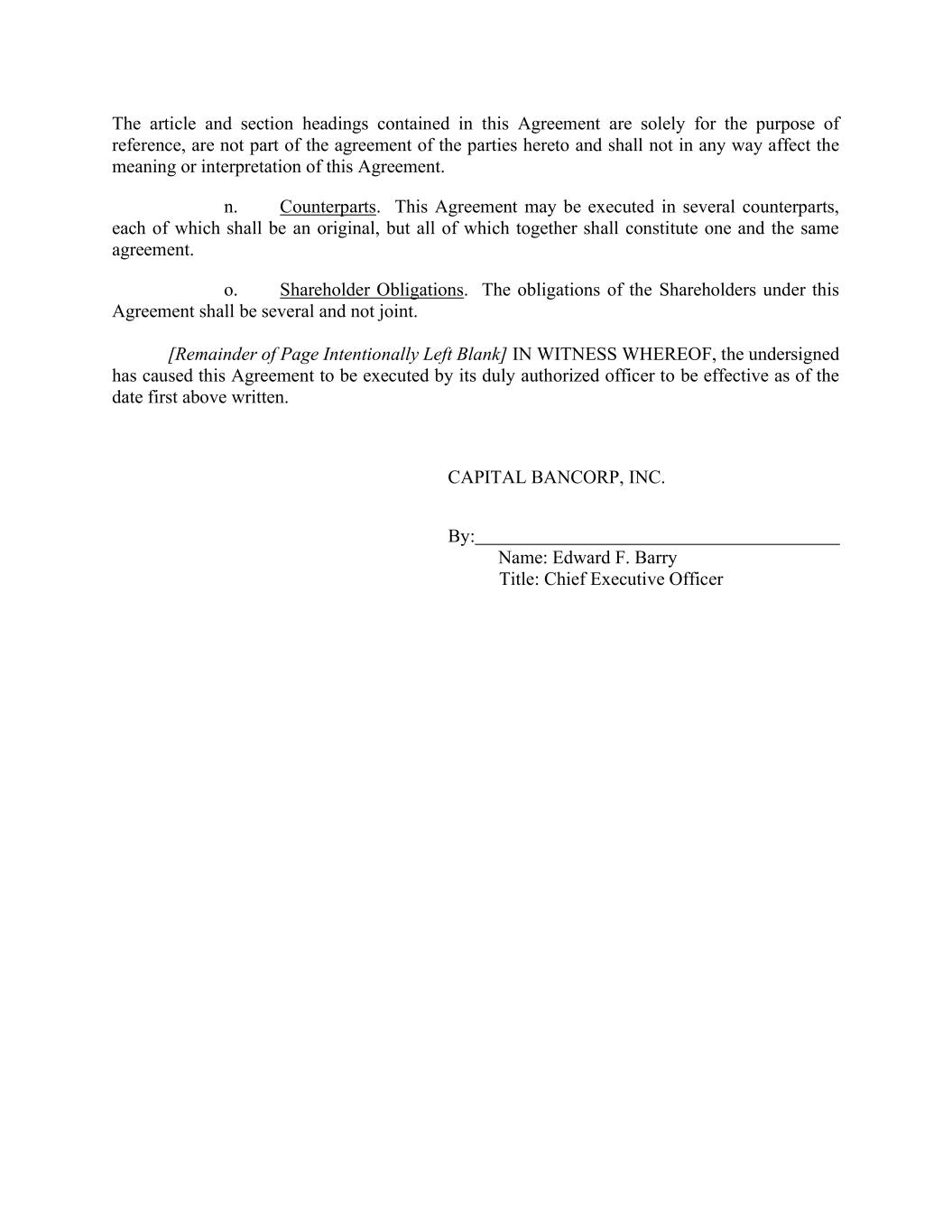 The article and section headings contained in this Agreement are solely for the purpose of reference, are not part of the agreement of the parties hereto and shall not in any way affect the meaning or interpretation of this Agreement. n. Counterparts. This Agreement may be executed in several counterparts, each of which shall be an original, but all of which together shall constitute one and the same agreement. o. Shareholder Obligations. The obligations of the Shareholders under this Agreement shall be several and not joint. [Remainder of Page Intentionally Left Blank] IN WITNESS WHEREOF, the undersigned has caused this Agreement to be executed by its duly authorized officer to be effective as of the date first above written. CAPITAL BANCORP, INC. By: Name: Edward F. Barry Title: Chief Executive Officer