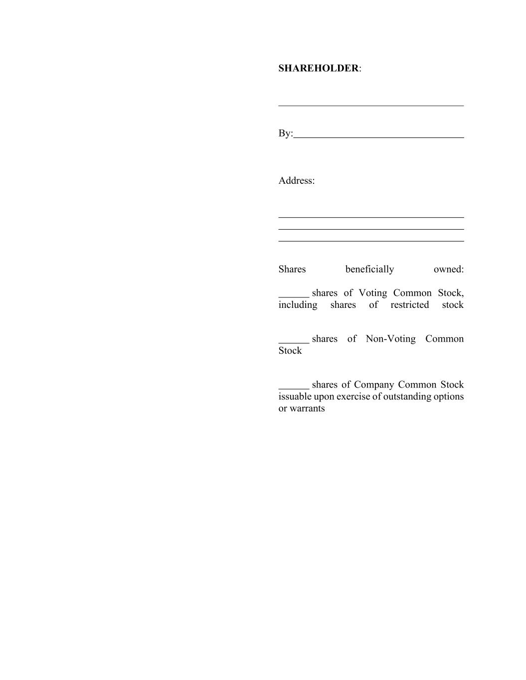 SHAREHOLDER: ____________________________________ By: Address: Shares beneficially owned: shares of Voting Common Stock, including shares of restricted stock shares of Non-Voting Common Stock shares of Company Common Stock issuable upon exercise of outstanding options or warrants