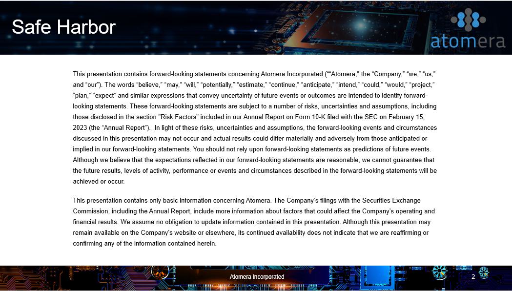 Safe Harbor This presentation contains forward - looking statements concerning Atomera Incorporated (““Atomera,” the “Company,” “we,” “us,” and “our”). The words “believe,” “may,” “will,” “potentially,” “estimate,” “continue,” “anticipate,” “intend,” “could,” “woul d,” “project,” “plan,” “expect” and similar expressions that convey uncertainty of future events or outcomes are intended to identify forwar d - looking statements. These forward - looking statements are subject to a number of risks, uncertainties and assumptions, including those disclosed in the section "Risk Factors" included in our Annual Report on Form 10 - K filed with the SEC on February 15, 2023 (the “Annual Report ”) . In light of these risks, uncertainties and assumptions, the forward - looking events and circumstances discussed in this presentation may not occur and actual results could differ materially and adversely from those anticipated or implied in our forward - looking statements. You should not rely upon forward - looking statements as predictions of future events. Although we believe that the expectations reflected in our forward - looking statements are reasonable, we cannot guarantee that the future results, levels of activity, performance or events and circumstances described in the forward - looking statements will be achieved or occur. This presentation contains only basic information concerning Atomera. The Company’s filings with the Securities Exchange Commission, including the Annual Report, include more information about factors that could affect the Company’s operating and financial results. We assume no obligation to update information contained in this presentation. Although this presentation m ay remain available on the Company's website or elsewhere, its continued availability does not indicate that we are reaffirming or confirming any of the information contained herein. Atomera Incorporated 2