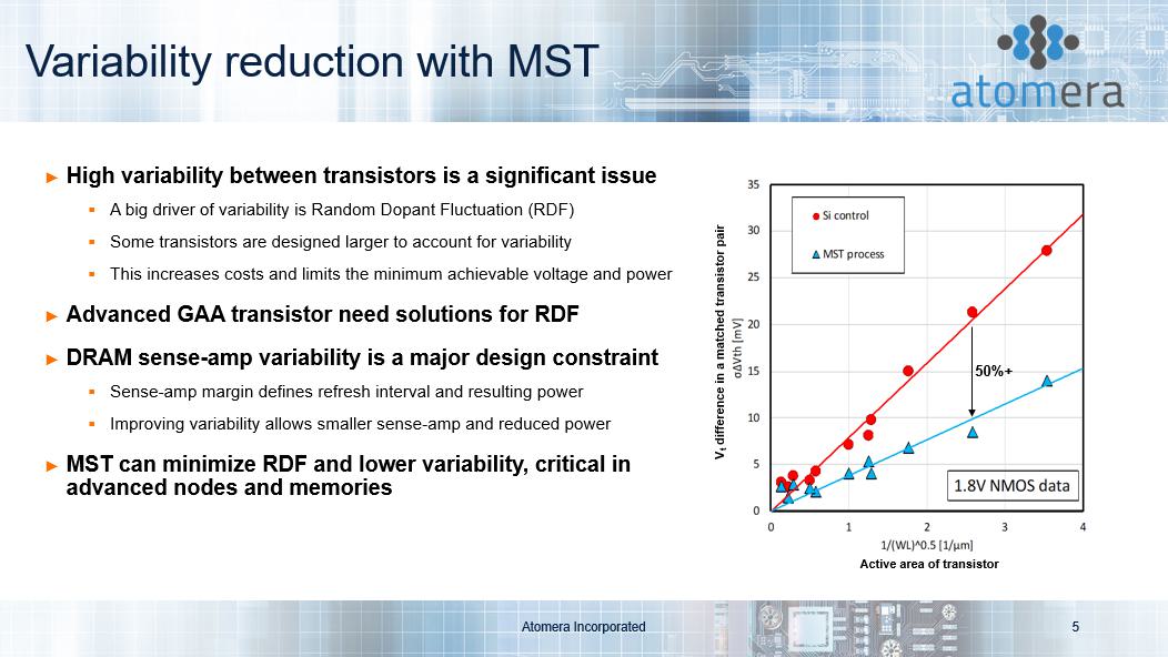 Variability reduction with MST ► High variability between transistors is a significant issue ▪ A big driver of variability is Random Dopant Fluctuation (RDF) ▪ Some transistors are designed larger to account for variability ▪ This increases costs and limits the minimum achievable voltage and power ► Advanced GAA transistor need solutions for RDF ► DRAM sense - amp variability is a major design constraint ▪ Sense - amp margin defines refresh interval and resulting power ▪ Improving variability allows smaller sense - amp and reduced power ► MST can minimize RDF and lower variability, critical in advanced nodes and memories Atomera Incorporated 5 V t difference in a matched transistor pair Active area of transistor 50%+