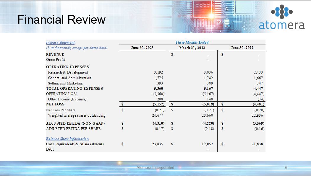 Financial Review Atomera Incorporated 6 Income Statement ($ in thousands, except per-share data) June 30, 2023 March 31, 2023 June 30, 2022 REVENUE -$ -$ Gross Profit - - OPERATING EXPENSES Research & Development 3,192 3,036 2,433 General and Administration 1,775 1,742 1,667 Selling and Marketing 393 389 347 TOTAL OPERATING EXPENSES 5,360 5,167 4,447 OPERATING LOSS (5,360) (5,167) (4,447) Other Income (Expense) 208 148 (34) NET LOSS (5,152)$ (5,019)$ (4,481)$ Net Loss Per Share (0.21)$ (0.21)$ (0.20)$ Weighted average shares outstanding 24,677 23,660 22,936 ADJUSTED EBITDA (NON-GAAP) (4,310)$ (4,220)$ (3,569)$ ADJUSTED EBITDA PER SHARE (0.17)$ (0.18)$ (0.16)$ Balance Sheet Information Cash, equivalents & ST investments 23,835$ 17,052$ 21,838$ Debt - - Three Months Ended