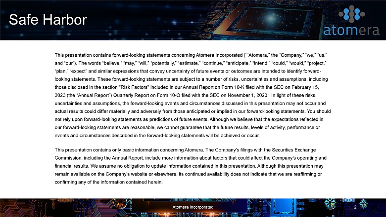 Safe Harbor This presentation contains forward - looking statements concerning Atomera Incorporated (““Atomera,” the “Company,” “we,” “us,” and “our”). The words “believe,” “may,” “will,” “potentially,” “estimate,” “continue,” “anticipate,” “intend,” “could,” “woul d,” “project,” “plan,” “expect” and similar expressions that convey uncertainty of future events or outcomes are intended to identify forwar d - looking statements. These forward - looking statements are subject to a number of risks, uncertainties and assumptions, including those disclosed in the section "Risk Factors" included in our Annual Report on Form 10 - K filed with the SEC on February 15, 2023 (the “Annual Report ”) Quarterly Report on Form 10 - Q filed with the SEC on November 1, 2023. In light of these risks, uncertainties and assumptions, the forward - looking events and circumstances discussed in this presentation may not occur and actual results could differ materially and adversely from those anticipated or implied in our forward - looking statements. You sh ould not rely upon forward - looking statements as predictions of future events. Although we believe that the expectations reflected in our forward - looking statements are reasonable, we cannot guarantee that the future results, levels of activity, performance or events and circumstances described in the forward - looking statements will be achieved or occur. This presentation contains only basic information concerning Atomera. The Company’s filings with the Securities Exchange Commission, including the Annual Report, include more information about factors that could affect the Company’s operating and financial results. We assume no obligation to update information contained in this presentation. Although this presentation m ay remain available on the Company's website or elsewhere, its continued availability does not indicate that we are reaffirming or confirming any of the information contained herein. Atomera Incorporated 2