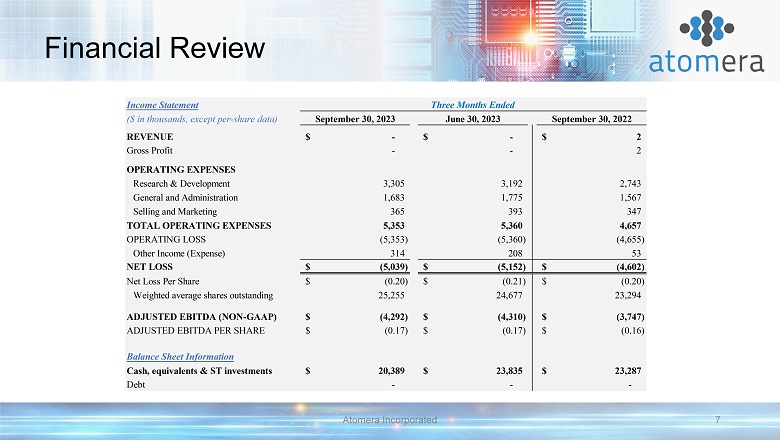 Financial Review Atomera Incorporated 7 Income Statement ($ in thousands, except per-share data) September 30, 2023 June 30, 2023 September 30, 2022 REVENUE -$ -$ 2$ Gross Profit - - 2 OPERATING EXPENSES Research & Development 3,305 3,192 2,743 General and Administration 1,683 1,775 1,567 Selling and Marketing 365 393 347 TOTAL OPERATING EXPENSES 5,353 5,360 4,657 OPERATING LOSS (5,353) (5,360) (4,655) Other Income (Expense) 314 208 53 NET LOSS (5,039)$ (5,152)$ (4,602)$ Net Loss Per Share (0.20)$ (0.21)$ (0.20)$ Weighted average shares outstanding 25,255 24,677 23,294 ADJUSTED EBITDA (NON-GAAP) (4,292)$ (4,310)$ (3,747)$ ADJUSTED EBITDA PER SHARE (0.17)$ (0.17)$ (0.16)$ Balance Sheet Information Cash, equivalents & ST investments 20,389$ 23,835$ 23,287$ Debt - - - Three Months Ended