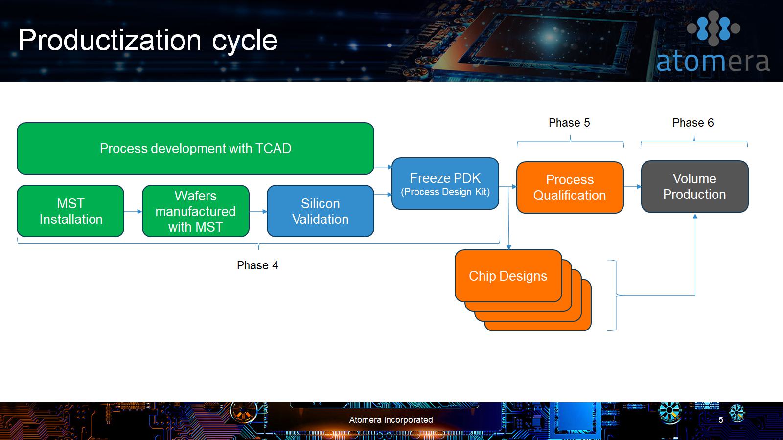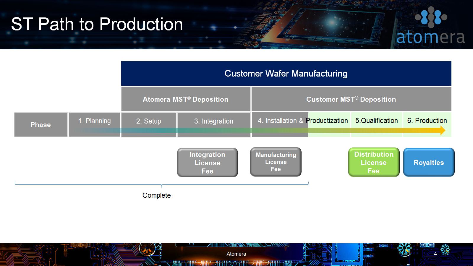 ST Path to Production Atomera 4 Customer Wafer Manufacturing Atomera MST ® Deposition 2. Setup Customer MST ® Deposition 3. Integration 4. Installation 5.Qualification 6. Production 1. Planning Phase Royalties Manufacturing License Fee Distribution License Fee Complete Integration License Fee & Productization