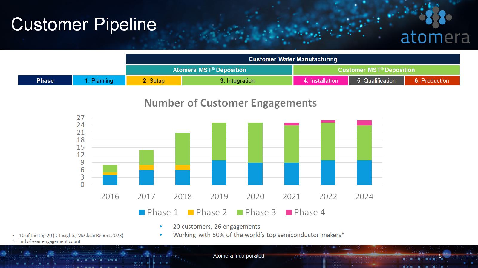 Chip Designs Start Productization cycle Atomera Incorporated 5 Freeze PDK (Process Design Kit) Silicon Validation Wafers manufactured with MST Process development with TCAD Process Qualification Volume Production Chip Designs Start Chip Designs Start Chip Designs MST Installation Phase 4 Phase 5 Phase 6