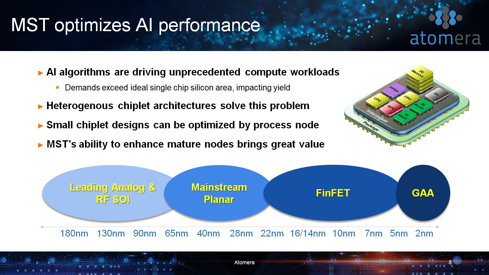 MST optimizes AI performance ► AI algorithms are driving unprecedented compute workloads ▪ Demands exceed ideal single chip silicon area, impacting yield ► Heterogenous chiplet architectures solve this problem ► Small chiplet designs can be optimized by process node ► MST’s ability to enhance mature nodes brings great value Atomera 8 180nm 130nm 90nm 65nm 40nm 28nm 22nm 16/14nm 10nm 7nm 5nm 2nm Leading Analog & RF SOI Mainstream Planar FinFET GAA