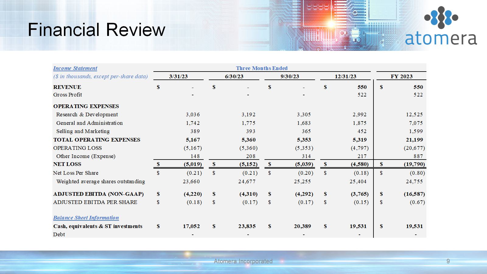 Financial Review Atomera Incorporated 9 Income Statement ($ in thousands, except per-share data) 3/31/23 6/30/23 9/30/23 12/31/23 FY 2023 REVENUE -$ -$ -$ 550$ 550$ Gross Profit - - - 522 522 OPERATING EXPENSES Research & Development 3,036 3,192 3,305 2,992 12,525 General and Administration 1,742 1,775 1,683 1,875 7,075 Selling and Marketing 389 393 365 452 1,599 TOTAL OPERATING EXPENSES 5,167 5,360 5,353 5,319 21,199 OPERATING LOSS (5,167) (5,360) (5,353) (4,797) (20,677) Other Income (Expense) 148 208 314 217 887 NET LOSS (5,019)$ (5,152)$ (5,039)$ (4,580)$ (19,790)$ Net Loss Per Share (0.21)$ (0.21)$ (0.20)$ (0.18)$ (0.80)$ Weighted average shares outstanding 23,660 24,677 25,255 25,404 24,755 ADJUSTED EBITDA (NON-GAAP) (4,220)$ (4,310)$ (4,292)$ (3,765)$ (16,587)$ ADJUSTED EBITDA PER SHARE (0.18)$ (0.17)$ (0.17)$ (0.15)$ (0.67)$ Balance Sheet Information Cash, equivalents & ST investments 17,052$ 23,835$ 20,389$ 19,531$ 19,531$ Debt - - - - - Three Months Ended