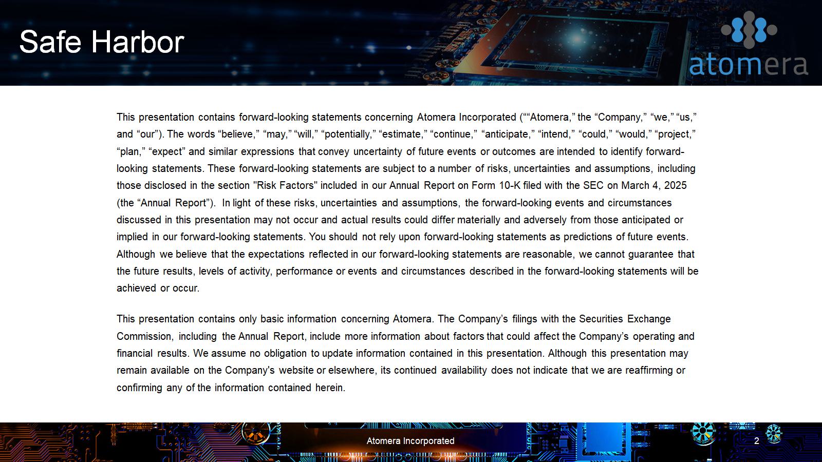 Safe Harbor This presentation contains forward - looking statements concerning Atomera Incorporated (““Atomera,” the “Company,” “we,” “us,” and “our”). The words “believe,” “may,” “will,” “potentially,” “estimate,” “continue,” “anticipate,” “intend,” “could,” “woul d,” “project,” “plan,” “expect” and similar expressions that convey uncertainty of future events or outcomes are intended to identify forwar d - looking statements. These forward - looking statements are subject to a number of risks, uncertainties and assumptions, including those disclosed in the section "Risk Factors" included in our Annual Report on Form 10 - K filed with the SEC on March 4 , 2025 (the “Annual Report ”). In light of these risks, uncertainties and assumptions, the forward - looking events and circumstances discussed in this presentation may not occur and actual results could differ materially and adversely from those anticipated or implied in our forward - looking statements. You should not rely upon forward - looking statements as predictions of future events. Although we believe that the expectations reflected in our forward - looking statements are reasonable, we cannot guarantee that the future results, levels of activity, performance or events and circumstances described in the forward - looking statements will be achieved or occur. This presentation contains only basic information concerning Atomera. The Company’s filings with the Securities Exchange Commission, including the Annual Report, include more information about factors that could affect the Company’s operating and financial results. We assume no obligation to update information contained in this presentation. Although this presentation m ay remain available on the Company's website or elsewhere, its continued availability does not indicate that we are reaffirming or confirming any of the information contained herein. Atomera Incorporated 2