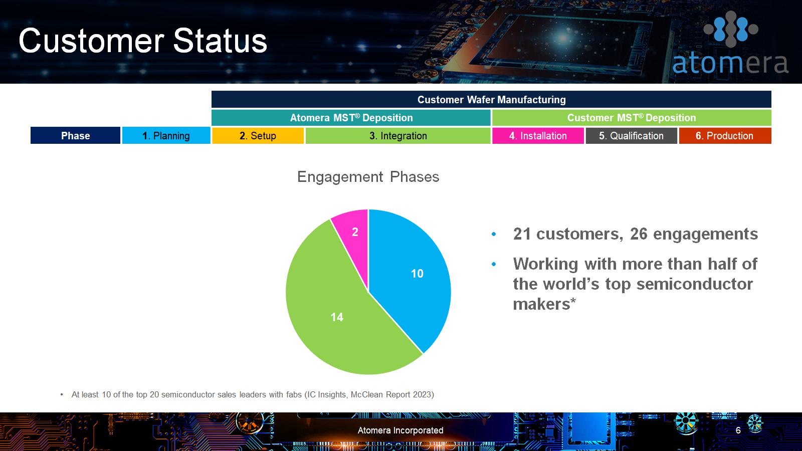 Customer Status 10 14 2 Engagement Phases Atomera Incorporated 6 Customer Wafer Manufacturing v Customer MST ® Deposition Atomera MST ® Deposition 6 . Production 5 . Qualification 4 . Installation 3 . Integration 2 . Setup 1 . Planning Phase • 21 customers, 26 engagements • Working with more than half of the world’s top semiconductor makers* • At least 10 of the top 20 semiconductor sales leaders with fabs (IC Insights, McClean Report 2023)
