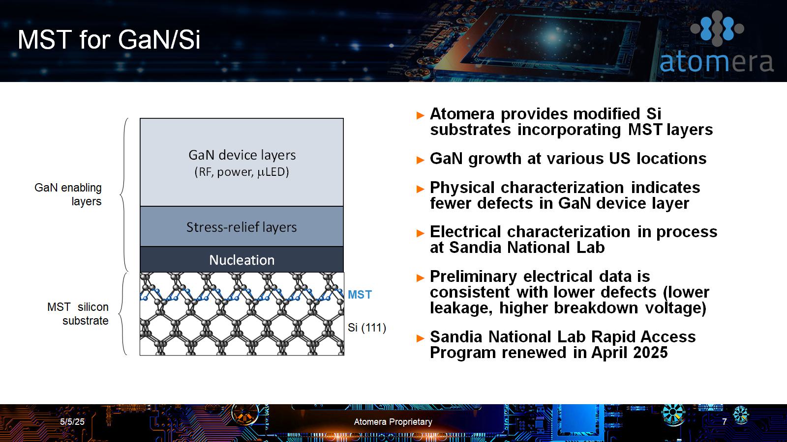 MST for GaN/Si ► Atomera provides modified Si substrates incorporating MST layers ► GaN growth at various US locations ► Physical characterization indicates fewer defects in GaN device layer ► Electrical characterization in process at Sandia National Lab ► Preliminary electrical data is consistent with lower defects (lower leakage, higher breakdown voltage) ► Sandia National Lab Rapid Access Program renewed in April 2025 5/5/25 Atomera Proprietary 7 Nucleation Stress - relief layers GaN device layers (RF, power, m LED ) Si substrate w/ MST GaN enabling layers MST Si (111) MST silicon substrate