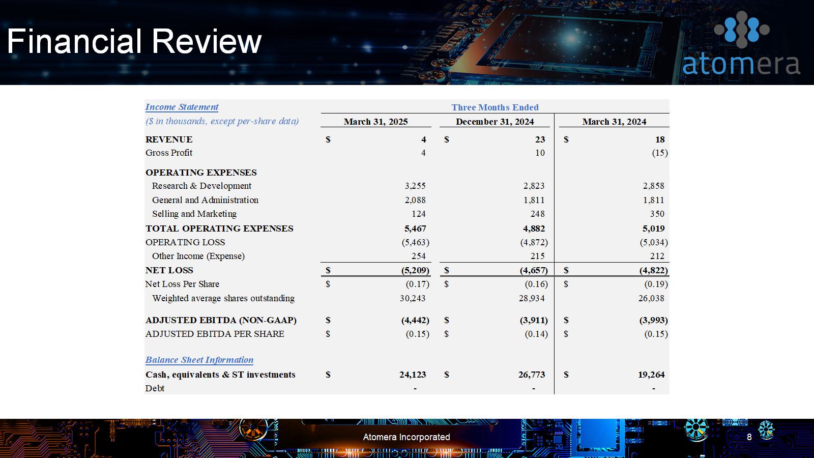 Financial Review Atomera Incorporated 8 Income Statement ($ in thousands, except per-share data) March 31, 2025 December 31, 2024 March 31, 2024 REVENUE 4$ 23$ 18$ Gross Profit 4 10 (15) OPERATING EXPENSES Research & Development 3,255 2,823 2,858 General and Administration 2,088 1,811 1,811 Selling and Marketing 124 248 350 TOTAL OPERATING EXPENSES 5,467 4,882 5,019 OPERATING LOSS (5,463) (4,872) (5,034) Other Income (Expense) 254 215 212 NET LOSS (5,209)$ (4,657)$ (4,822)$ Net Loss Per Share (0.17)$ (0.16)$ (0.19)$ Weighted average shares outstanding 30,243 28,934 26,038 ADJUSTED EBITDA (NON-GAAP) (4,442)$ (3,911)$ (3,993)$ ADJUSTED EBITDA PER SHARE (0.15)$ (0.14)$ (0.15)$ Balance Sheet Information Cash, equivalents & ST investments 24,123$ 26,773$ 19,264$ Debt - - - Three Months Ended