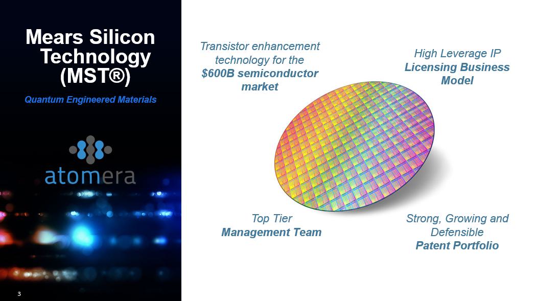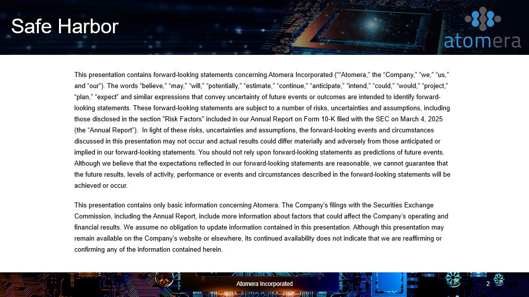 Safe Harbor This presentation contains forward - looking statements concerning Atomera Incorporated (““Atomera,” the “Company,” “we,” “us,” and “our”). The words “believe,” “may,” “will,” “potentially,” “estimate,” “continue,” “anticipate,” “intend,” “could,” “woul d,” “project,” “plan,” “expect” and similar expressions that convey uncertainty of future events or outcomes are intended to identify forwar d - looking statements. These forward - looking statements are subject to a number of risks, uncertainties and assumptions, including those disclosed in the section "Risk Factors" included in our Annual Report on Form 10 - K filed with the SEC on March 4, 2025 (the “Annual Report ”). In light of these risks, uncertainties and assumptions, the forward - looking events and circumstances discussed in this presentation may not occur and actual results could differ materially and adversely from those anticipated or implied in our forward - looking statements. You should not rely upon forward - looking statements as predictions of future events. Although we believe that the expectations reflected in our forward - looking statements are reasonable, we cannot guarantee that the future results, levels of activity, performance or events and circumstances described in the forward - looking statements will be achieved or occur. This presentation contains only basic information concerning Atomera. The Company’s filings with the Securities Exchange Commission, including the Annual Report, include more information about factors that could affect the Company’s operating and financial results. We assume no obligation to update information contained in this presentation. Although this presentation m ay remain available on the Company's website or elsewhere, its continued availability does not indicate that we are reaffirming or confirming any of the information contained herein. Atomera Incorporated 2