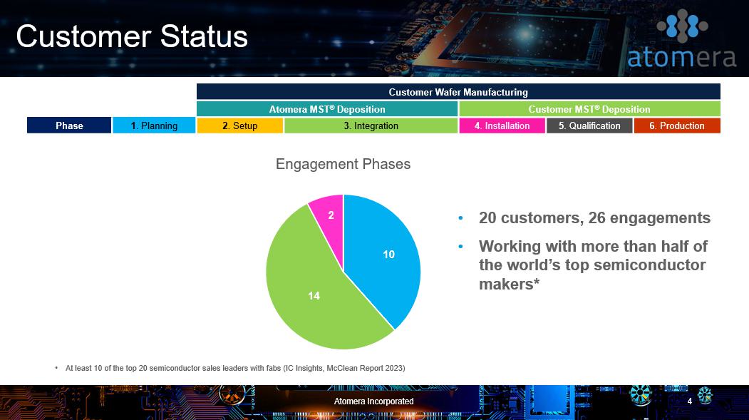 Customer Status 10 14 2 Engagement Phases Atomera Incorporated 4 Customer Wafer Manufacturing v Customer MST ® Deposition Atomera MST ® Deposition 6 . Production 5 . Qualification 4 . Installation 3 . Integration 2 . Setup 1 . Planning Phase • 20 customers, 26 engagements • Working with more than half of the world’s top semiconductor makers* • At least 10 of the top 20 semiconductor sales leaders with fabs (IC Insights, McClean Report 2023)