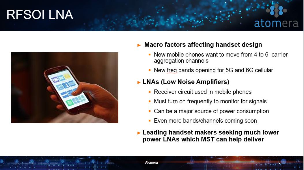 RFSOI LNA ► Macro factors affecting handset design ▪ New mobile phones want to move from 4 to 6 carrier aggregation channels ▪ New freq bands opening for 5G and 6G cellular ► LNAs (Low Noise Amplifiers) ▪ Receiver circuit used in mobile phones ▪ Must turn on frequently to monitor for signals ▪ Can be a major source of power consumption ▪ Even more bands/channels coming soon ► Leading handset makers seeking much lower power LNAs which MST can help deliver Atomera 6