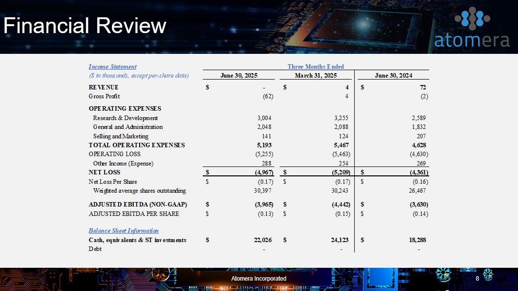 Financial Review Atomera Incorporated 8 Income Statement ($ in thousands, except per-share data) June 30, 2025 March 31, 2025 June 30, 2024 REVENUE -$ 4$ 72$ Gross Profit (62) 4 (2) OPERATING EXPENSES Research & Development 3,004 3,255 2,589 General and Administration 2,048 2,088 1,832 Selling and Marketing 141 124 207 TOTAL OPERATING EXPENSES 5,193 5,467 4,628 OPERATING LOSS (5,255) (5,463) (4,630) Other Income (Expense) 288 254 269 NET LOSS (4,967)$ (5,209)$ (4,361)$ Net Loss Per Share (0.17)$ (0.17)$ (0.16)$ Weighted average shares outstanding 30,397 30,243 26,467 ADJUSTED EBITDA (NON-GAAP) (3,965)$ (4,442)$ (3,630)$ ADJUSTED EBITDA PER SHARE (0.13)$ (0.15)$ (0.14)$ Balance Sheet Information Cash, equivalents & ST investments 22,026$ 24,123$ 18,288$ Debt - - - Three Months Ended