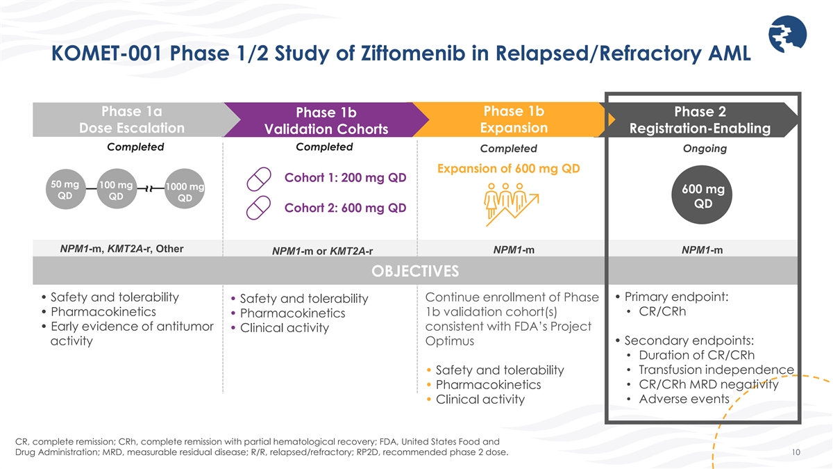 KOMET-001 Phase 1/2 Study of Ziftomenib in Relapsed/Refractory AML Phase 1a Phase 1b Phase 2 Phase 1b Dose Escalation Expansion Registration-Enabling Validation Cohorts (Ongoing) Completed Completed Completed Ongoing Expansion of 600 mg QD Cohort 1: 200 mg QD 50 mg 100 mg 1000 mg 600 mg QD QD QD QD Cohort 2: 600 mg QD NPM1-m, KMT2A-r, Other NPM1-m NPM1-m NPM1-m or KMT2A-r OBJECTIVES • Safety and tolerability Continue enrollment of Phase • Primary endpoint: • Safety and tolerability • CR/CRh • Pharmacokinetics 1b validation cohort(s) • Pharmacokinetics • Early evidence of antitumor consistent with FDA’s Project • Clinical activity • Secondary endpoints: activity Optimus • Duration of CR/CRh • Safety and tolerability • Transfusion independence • Pharmacokinetics • CR/CRh MRD negativity • Adverse events • Clinical activity CR, complete remission; CRh, complete remission with partial hematological recovery; FDA, United States Food and Drug Administration; MRD, measurable residual disease; R/R, relapsed/refractory; RP2D, recommended phase 2 dose. 10 ~ ~