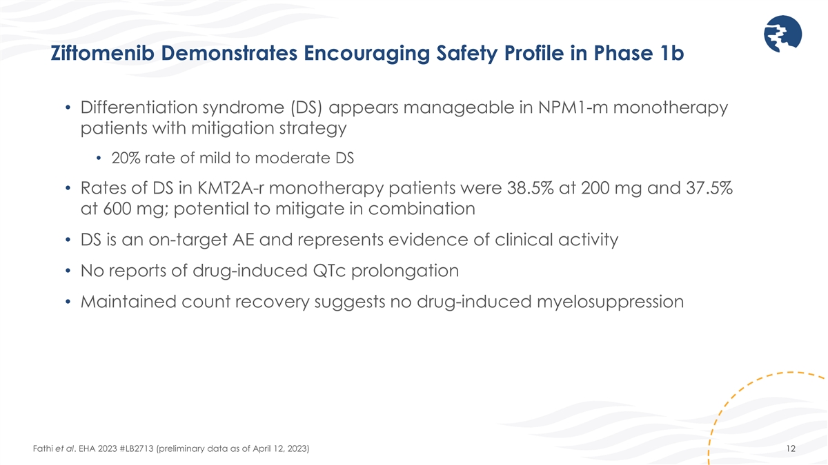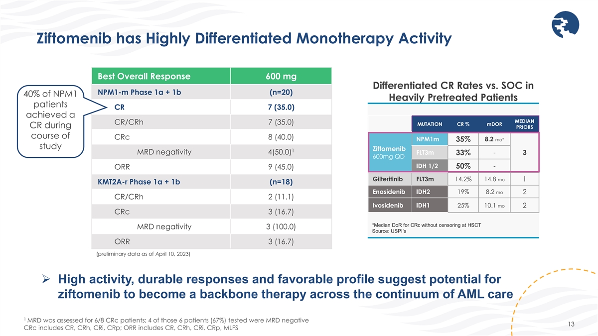Ziftomenib Demonstrates Encouraging Safety Profile in Phase 1b • Differentiation syndrome (DS) appears manageable in NPM1-m monotherapy patients with mitigation strategy • 20% rate of mild to moderate DS • Rates of DS in KMT2A-r monotherapy patients were 38.5% at 200 mg and 37.5% at 600 mg; potential to mitigate in combination • DS is an on-target AE and represents evidence of clinical activity • No reports of drug-induced QTc prolongation • Maintained count recovery suggests no drug-induced myelosuppression Fathi et al. EHA 2023 #LB2713 (preliminary data as of April 12, 2023) 12