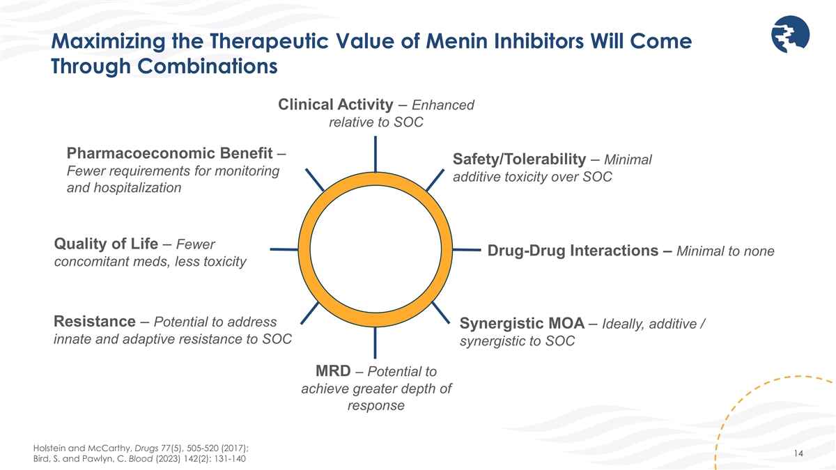Maximizing the Therapeutic Value of Menin Inhibitors Will Come Through Combinations Clinical Activity – Enhanced relative to SOC Pharmacoeconomic Benefit – Safety/Tolerability – Minimal Fewer requirements for monitoring additive toxicity over SOC and hospitalization Quality of Life – Fewer Drug-Drug Interactions – Minimal to none concomitant meds, less toxicity Resistance – Potential to address Synergistic MOA – Ideally, additive / innate and adaptive resistance to SOC synergistic to SOC MRD – Potential to achieve greater depth of response Holstein and McCarthy, Drugs 77(5), 505-520 (2017); 14 Bird, S. and Pawlyn, C. Blood (2023) 142(2): 131-140