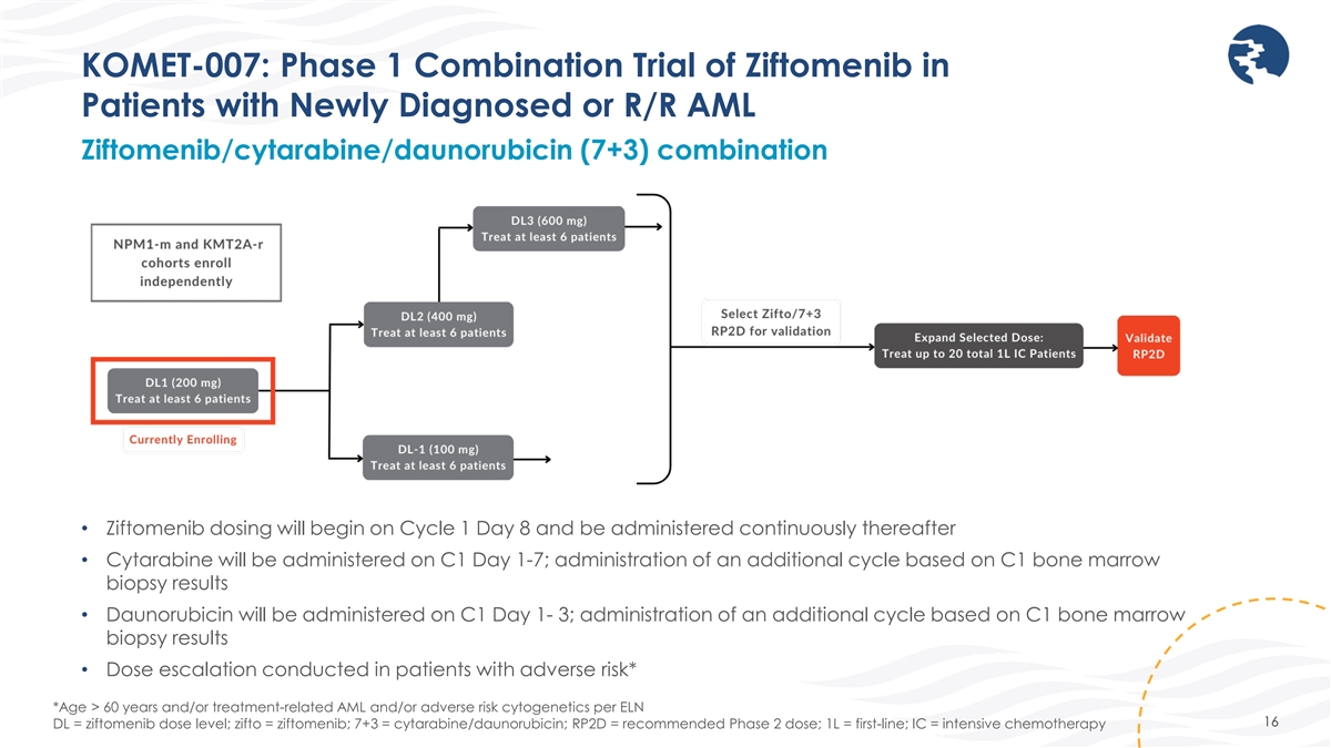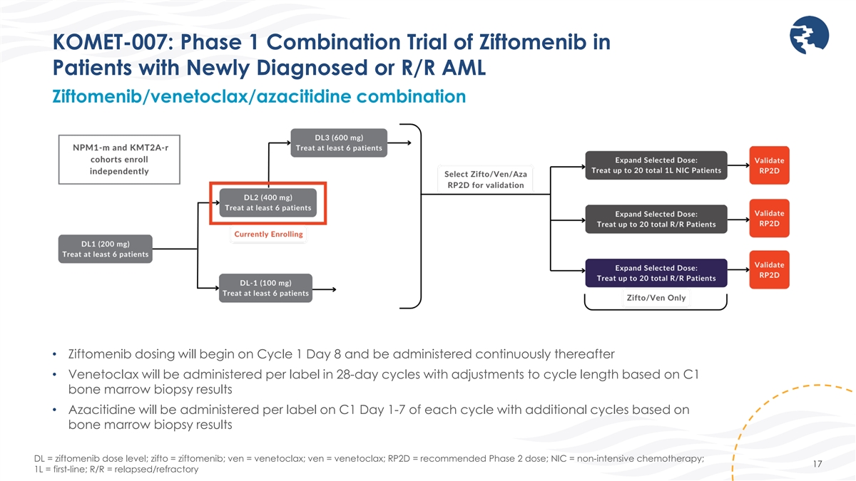 KOMET-007: Phase 1 Combination Trial of Ziftomenib in Patients with Newly Diagnosed or R/R AML Ziftomenib/cytarabine/daunorubicin (7+3) combination • Ziftomenib dosing will begin on Cycle 1 Day 8 and be administered continuously thereafter • Cytarabine will be administered on C1 Day 1-7; administration of an additional cycle based on C1 bone marrow biopsy results • Daunorubicin will be administered on C1 Day 1- 3; administration of an additional cycle based on C1 bone marrow biopsy results • Dose escalation conducted in patients with adverse risk* *Age > 60 years and/or treatment-related AML and/or adverse risk cytogenetics per ELN 16 DL = ziftomenib dose level; zifto = ziftomenib; 7+3 = cytarabine/daunorubicin; RP2D = recommended Phase 2 dose; 1L = first-line; IC = intensive chemotherapy