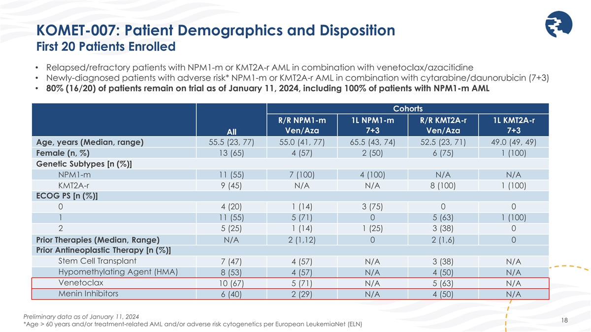 KOMET-007: Phase 1 Combination Trial of Ziftomenib in Patients with Newly Diagnosed or R/R AML Ziftomenib/venetoclax/azacitidine combination • Ziftomenib dosing will begin on Cycle 1 Day 8 and be administered continuously thereafter • Venetoclax will be administered per label in 28-day cycles with adjustments to cycle length based on C1 bone marrow biopsy results • Azacitidine will be administered per label on C1 Day 1-7 of each cycle with additional cycles based on bone marrow biopsy results DL = ziftomenib dose level; zifto = ziftomenib; ven = venetoclax; ven = venetoclax; RP2D = recommended Phase 2 dose; NIC = non-intensive chemotherapy; 17 1L = first-line; R/R = relapsed/refractory