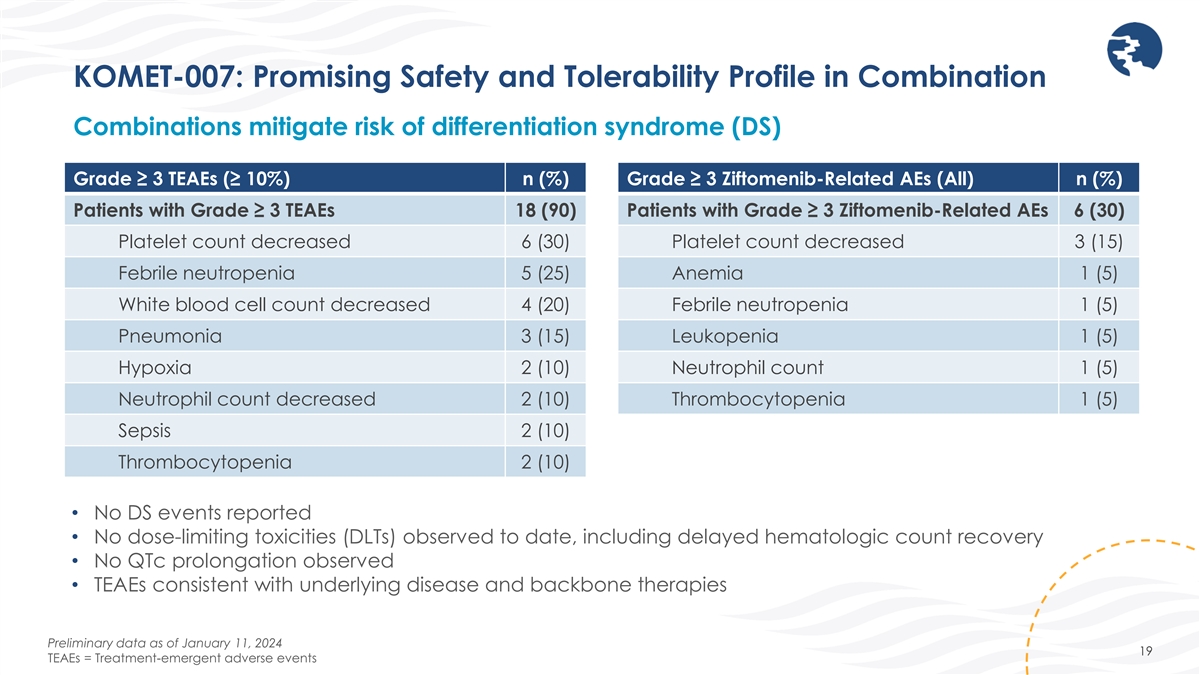 KOMET-007: Patient Demographics and Disposition First 20 Patients Enrolled • Relapsed/refractory patients with NPM1-m or KMT2A-r AML in combination with venetoclax/azacitidine • Newly-diagnosed patients with adverse risk* NPM1-m or KMT2A-r AML in combination with cytarabine/daunorubicin (7+3) • 80% (16/20) of patients remain on trial as of January 11, 2024, including 100% of patients with NPM1-m AML Cohorts R/R NPM1-m 1L NPM1-m R/R KMT2A-r 1L KMT2A-r Ven/Aza 7+3 Ven/Aza 7+3 All Age, years (Median, range) 55.5 (23, 77) 55.0 (41, 77) 65.5 (43, 74) 52.5 (23, 71) 49.0 (49, 49) 13 (65) 4 (57) 2 (50) 6 (75) 1 (100) Female (n, %) Genetic Subtypes [n (%)] NPM1-m 11 (55) 7 (100) 4 (100) N/A N/A KMT2A-r 9 (45) N/A N/A 8 (100) 1 (100) ECOG PS [n (%)] 0 4 (20) 1 (14) 3 (75) 0 0 1 11 (55) 5 (71) 0 5 (63) 1 (100) 2 5 (25) 1 (14) 1 (25) 3 (38) 0 Prior Therapies (Median, Range) N/A 2 (1,12) 0 2 (1,6) 0 Prior Antineoplastic Therapy [n (%)] Stem Cell Transplant 7 (47) 4 (57) N/A 3 (38) N/A Hypomethylating Agent (HMA) 8 (53) 4 (57) N/A 4 (50) N/A Venetoclax 10 (67) 5 (71) N/A 5 (63) N/A Menin Inhibitors 6 (40) 2 (29) N/A 4 (50) N/A Preliminary data as of January 11, 2024 18 *Age > 60 years and/or treatment-related AML and/or adverse risk cytogenetics per European LeukemiaNet (ELN)