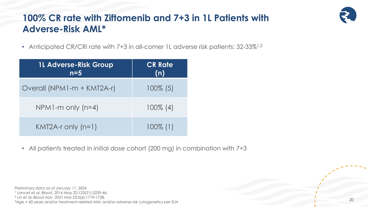 KOMET-007: Promising Safety and Tolerability Profile in Combination Combinations mitigate risk of differentiation syndrome (DS) Grade ≥ 3 TEAEs (≥ 10%) n (%) Grade ≥ 3 Ziftomenib-Related AEs (All) n (%) Patients with Grade ≥ 3 TEAEs 18 (90) Patients with Grade ≥ 3 Ziftomenib-Related AEs 6 (30) Platelet count decreased 6 (30) Platelet count decreased 3 (15) Febrile neutropenia 5 (25) Anemia 1 (5) White blood cell count decreased 4 (20) Febrile neutropenia 1 (5) Pneumonia 3 (15) Leukopenia 1 (5) Hypoxia 2 (10) Neutrophil count 1 (5) Neutrophil count decreased 2 (10) Thrombocytopenia 1 (5) Sepsis 2 (10) Thrombocytopenia 2 (10) • No DS events reported • No dose-limiting toxicities (DLTs) observed to date, including delayed hematologic count recovery • No QTc prolongation observed • TEAEs consistent with underlying disease and backbone therapies Preliminary data as of January 11, 2024 19 TEAEs = Treatment-emergent adverse events
