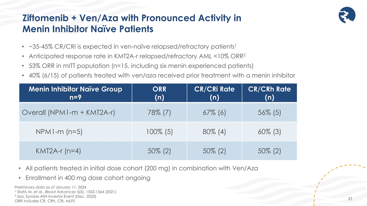 100% CR rate with Ziftomenib and 7+3 in 1L Patients with Adverse-Risk AML* 1,2 • Anticipated CR/CRi rate with 7+3 in all-comer 1L adverse risk patients: 32-33% 1L Adverse-Risk Group CR Rate n=5 (n) Overall (NPM1-m + KMT2A-r) 100% (5) NPM1-m only (n=4) 100% (4) KMT2A-r only (n=1) 100% (1) • All patients treated in initial dose cohort (200 mg) in combination with 7+3 Preliminary data as of January 11, 2024 1 Lancet et al. Blood. 2014 May 22;123(21):3239-46. 2 Lin et al. Blood Adv. 2021 Mar 23;5(6):1719-1728. 20 *Age > 60 years and/or treatment-related AML and/or adverse risk cytogenetics per ELN