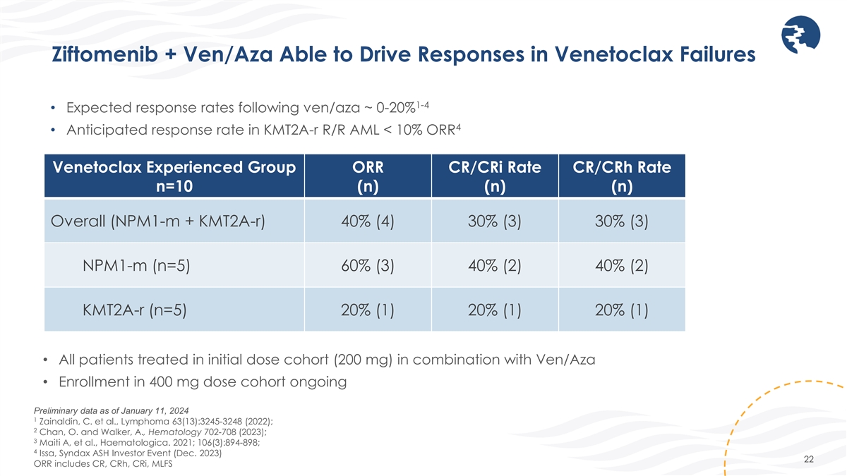 Ziftomenib + Ven/Aza with Pronounced Activity in Menin Inhibitor Naïve Patients 1 • ~35-45% CR/CRi is expected in ven-naïve relapsed/refractory patients 2 • Anticipated response rate in KMT2A-r relapsed/refractory AML <10% ORR • 53% ORR in mITT population (n=15, including six menin experienced patients) • 40% (6/15) of patients treated with ven/aza received prior treatment with a menin inhibitor Menin Inhibitor Naïve Group ORR CR/CRi Rate CR/CRh Rate n=9 (n) (n) (n) Overall (NPM1-m + KMT2A-r) 78% (7) 67% (6) 56% (5) NPM1-m (n=5) 100% (5) 80% (4) 60% (3) KMT2A-r (n=4) 50% (2) 50% (2) 50% (2) • All patients treated in initial dose cohort (200 mg) in combination with Ven/Aza • Enrollment in 400 mg dose cohort ongoing Preliminary data as of January 11, 2024 1 Stahl, M. et al., Blood Advances 5(5), 1552-1564 (2021) 2 Issa, Syndax ASH Investor Event (Dec. 2023) 21 ORR includes CR, CRh, CRi, MLFS