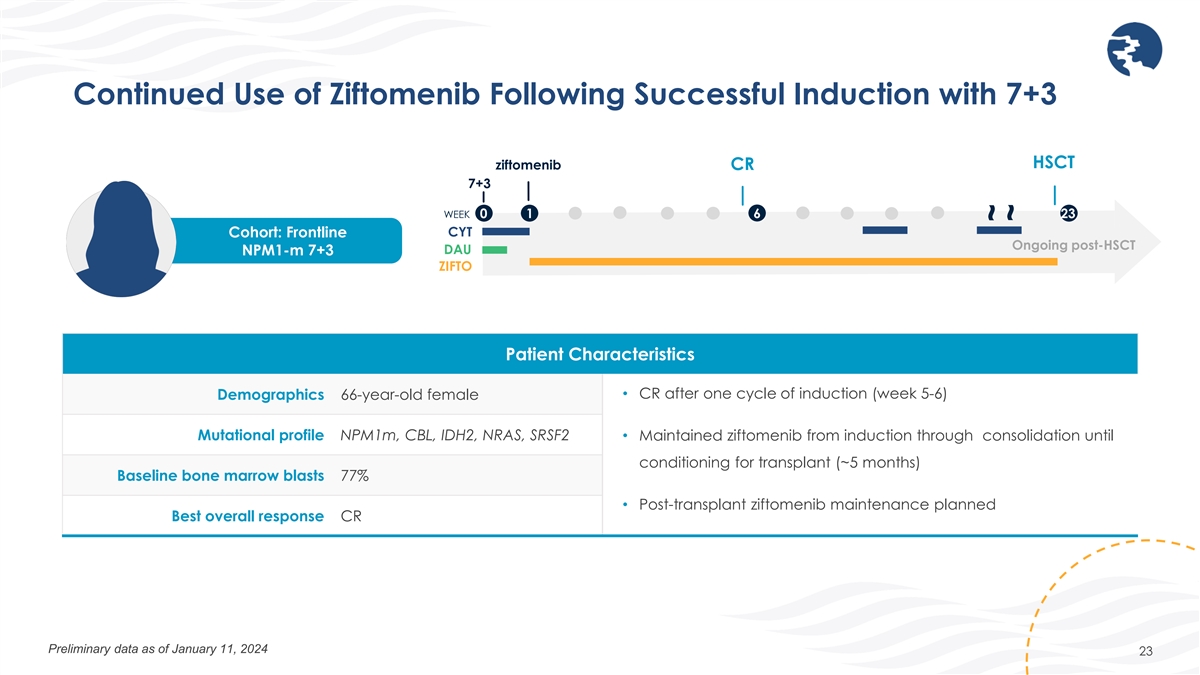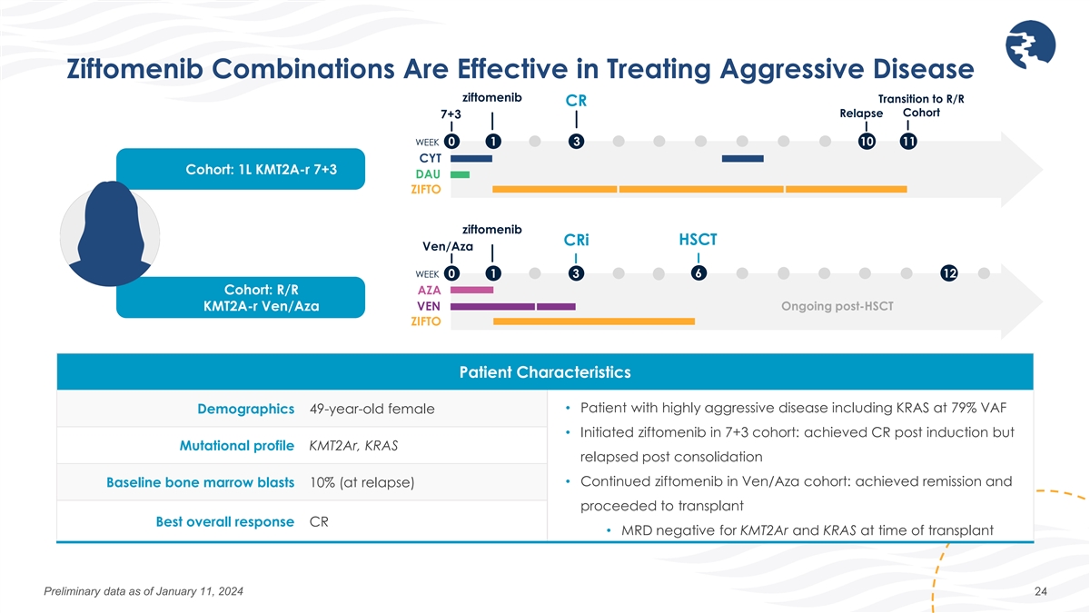 Continued Use of Ziftomenib Following Successful Induction with 7+3 HSCT ziftomenib CR 7+3 WEEK 0 1 6 23 CYT Cohort: Frontline Ongoing post-HSCT DAU NPM1-m 7+3 ZIFTO Patient Characteristics • CR after one cycle of induction (week 5-6) Demographics 66-year-old female Mutational profile NPM1m, CBL, IDH2, NRAS, SRSF2 • Maintained ziftomenib from induction through consolidation until conditioning for transplant (~5 months) Baseline bone marrow blasts 77% • Post-transplant ziftomenib maintenance planned Best overall response CR Preliminary data as of January 11, 2024 23 ~ ~