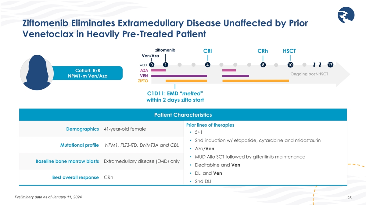 Ziftomenib Combinations Are Effective in Treating Aggressive Disease ziftomenib Transition to R/R CR Relapse Cohort 7+3 WEEK 0 1 3 10 11 CYT Cohort: 1L KMT2A-r 7+3 DAU ZIFTO ziftomenib CRi HSCT Ven/Aza 6 WEEK 0 1 3 12 Cohort: R/R AZA KMT2A-r Ven/Aza VEN Ongoing post-HSCT ZIFTO Patient Characteristics Demographics 49-year-old female • Patient with highly aggressive disease including KRAS at 79% VAF • Initiated ziftomenib in 7+3 cohort: achieved CR post induction but Mutational profile KMT2Ar, KRAS relapsed post consolidation • Continued ziftomenib in Ven/Aza cohort: achieved remission and Baseline bone marrow blasts 10% (at relapse) proceeded to transplant Best overall response CR • MRD negative for KMT2Ar and KRAS at time of transplant Preliminary data as of January 11, 2024 24