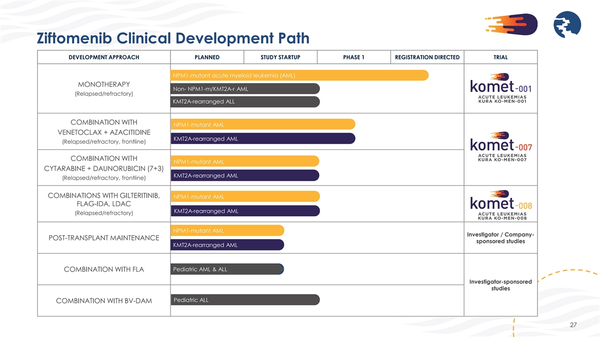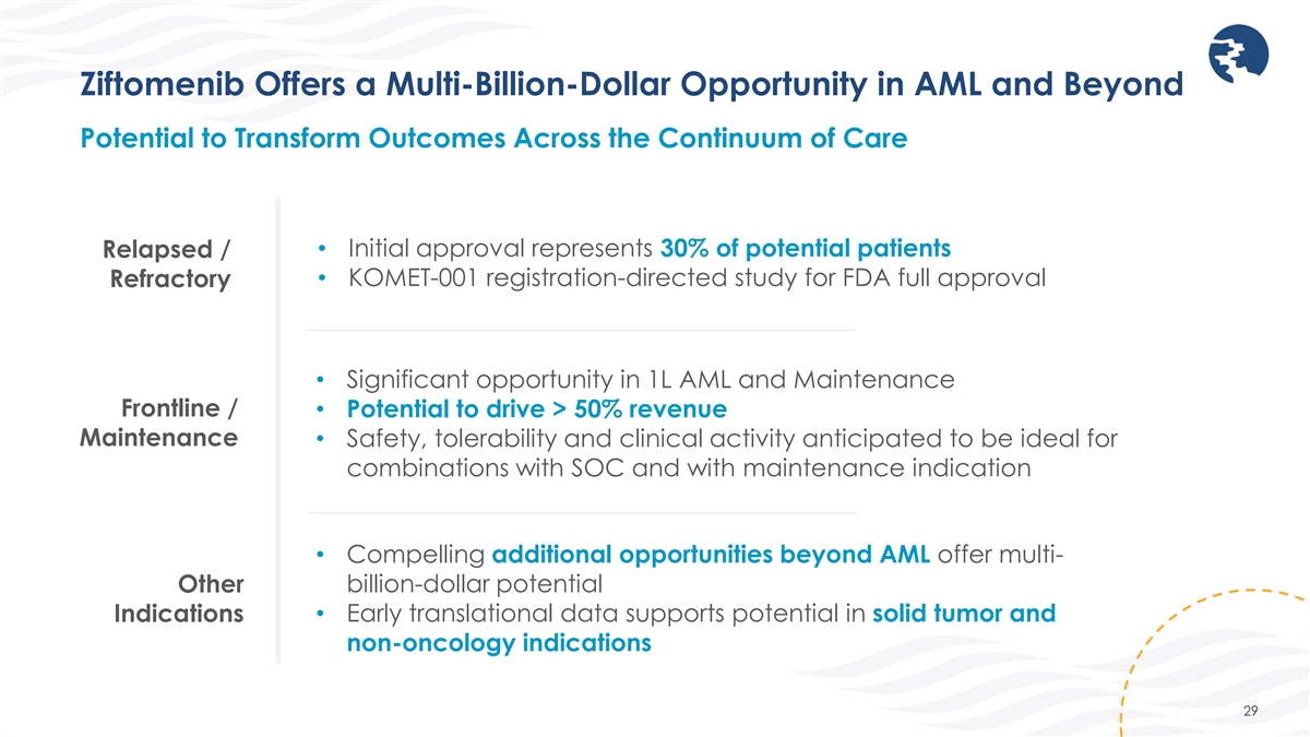 Ziftomenib Clinical Development Path DEVELOPMENT APPROACH PLANNED STUDY STARTUP PHASE 1 REGISTRATION DIRECTED TRIAL NPM1-mutant acute myeloid leukemia (AML) MONOTHERAPY Non- NPM1-m/KMT2A-r AML (Relapsed/refractory) KMT2A-rearranged ALL COMBINATION WITH NPM1-mutant AML VENETOCLAX + AZACITIDINE KMT2A-rearranged AML (Relapsed/refractory, frontline) COMBINATION WITH NPM1-mutant AML CYTARABINE + DAUNORUBICIN (7+3) KMT2A-rearranged AML (Relapsed/refractory, frontline) COMBINATIONS WITH GILTERITINIB, NPM1-mutant AML FLAG-IDA, LDAC KMT2A-rearranged AML (Relapsed/refractory) NPM1-mutant AML Investigator / Company- POST-TRANSPLANT MAINTENANCE sponsored studies KMT2A-rearranged AML Pediatric AML & ALL COMBINATION WITH FLA Investigator-sponsored studies Pediatric ALL COMBINATION WITH BV-DAM 27