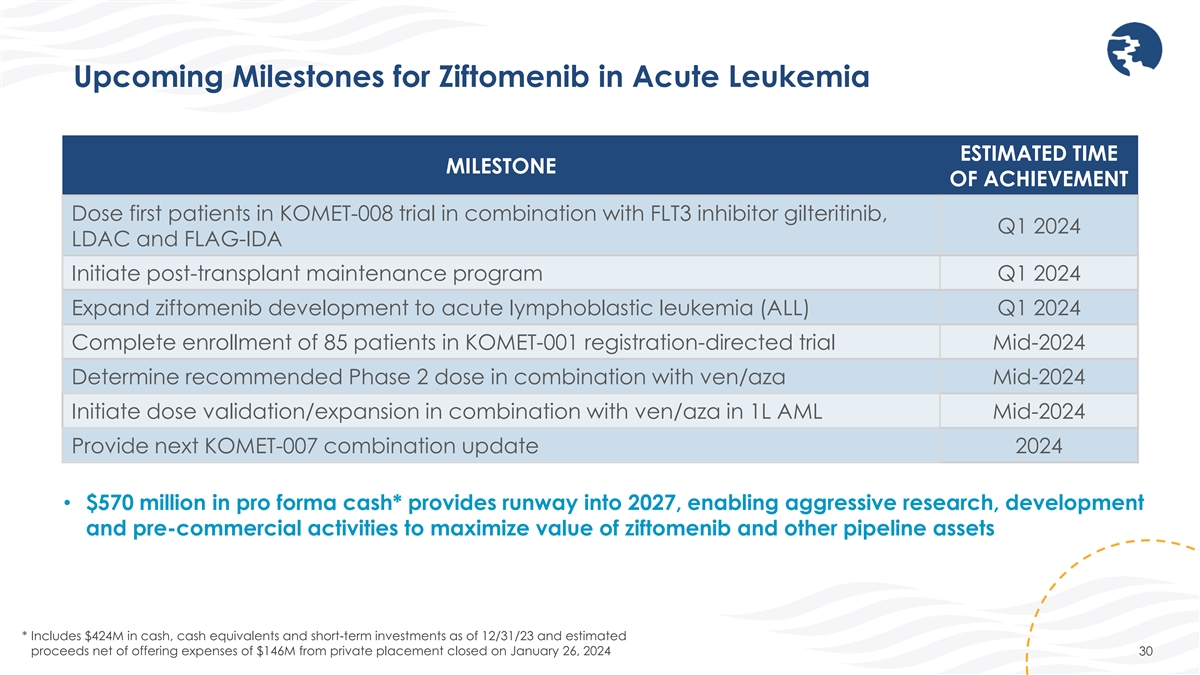 Ziftomenib Offers a Multi-Billion-Dollar Opportunity in AML and Beyond Potential to Transform Outcomes Across the Continuum of Care • Initial approval represents 30% of potential patients Relapsed / • KOMET-001 registration-directed study for FDA full approval Refractory • Significant opportunity in 1L AML and Maintenance Frontline / • Potential to drive > 50% revenue Maintenance • Safety, tolerability and clinical activity anticipated to be ideal for combinations with SOC and with maintenance indication • Compelling additional opportunities beyond AML offer multi- Other billion-dollar potential Indications • Early translational data supports potential in solid tumor and non-oncology indications 29