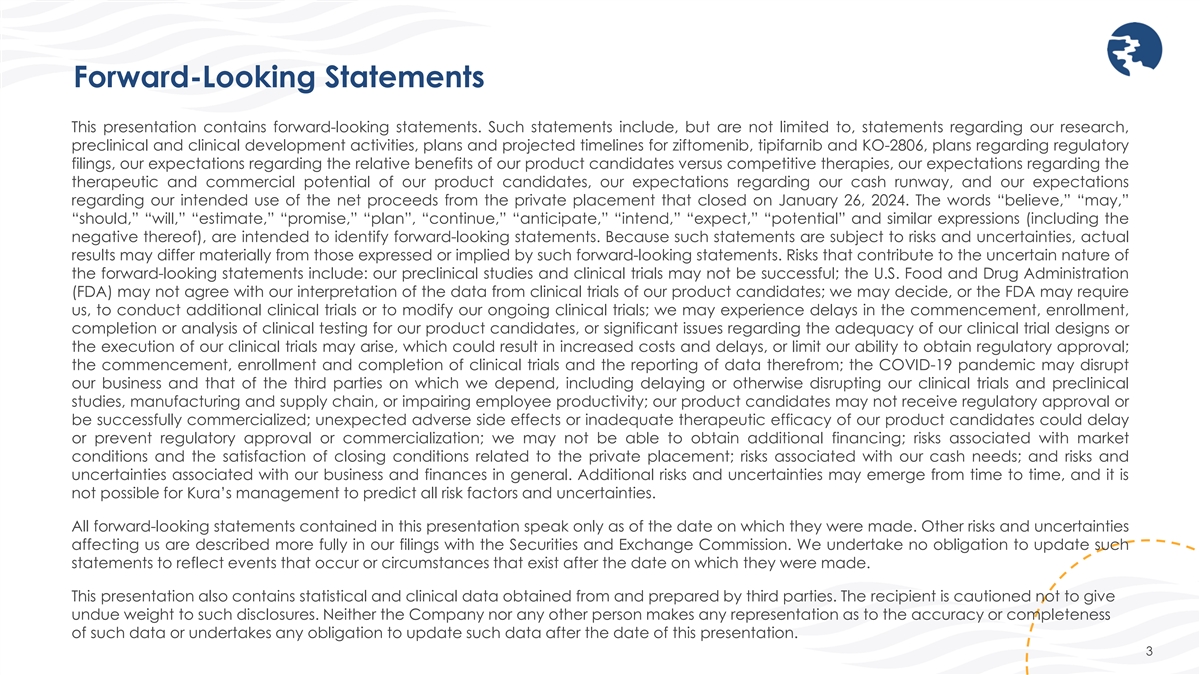 Forward-Looking Statements This presentation contains forward-looking statements. Such statements include, but are not limited to, statements regarding our research, preclinical and clinical development activities, plans and projected timelines for ziftomenib, tipifarnib and KO-2806, plans regarding regulatory filings, our expectations regarding the relative benefits of our product candidates versus competitive therapies, our expectations regarding the therapeutic and commercial potential of our product candidates, our expectations regarding our cash runway, and our expectations regarding our intended use of the net proceeds from the private placement that closed on January 26, 2024. The words “believe,” “may,” “should,” “will,” “estimate,” “promise,” “plan”, “continue,” “anticipate,” “intend,” “expect,” “potential” and similar expressions (including the negative thereof), are intended to identify forward-looking statements. Because such statements are subject to risks and uncertainties, actual results may differ materially from those expressed or implied by such forward-looking statements. Risks that contribute to the uncertain nature of the forward-looking statements include: our preclinical studies and clinical trials may not be successful; the U.S. Food and Drug Administration (FDA) may not agree with our interpretation of the data from clinical trials of our product candidates; we may decide, or the FDA may require us, to conduct additional clinical trials or to modify our ongoing clinical trials; we may experience delays in the commencement, enrollment, completion or analysis of clinical testing for our product candidates, or significant issues regarding the adequacy of our clinical trial designs or the execution of our clinical trials may arise, which could result in increased costs and delays, or limit our ability to obtain regulatory approval; the commencement, enrollment and completion of clinical trials and the reporting of data therefrom; the COVID-19 pandemic may disrupt our business and that of the third parties on which we depend, including delaying or otherwise disrupting our clinical trials and preclinical studies, manufacturing and supply chain, or impairing employee productivity; our product candidates may not receive regulatory approval or be successfully commercialized; unexpected adverse side effects or inadequate therapeutic efficacy of our product candidates could delay or prevent regulatory approval or commercialization; we may not be able to obtain additional financing; risks associated with market conditions and the satisfaction of closing conditions related to the private placement; risks associated with our cash needs; and risks and uncertainties associated with our business and finances in general. Additional risks and uncertainties may emerge from time to time, and it is not possible for Kura’s management to predict all risk factors and uncertainties. All forward-looking statements contained in this presentation speak only as of the date on which they were made. Other risks and uncertainties affecting us are described more fully in our filings with the Securities and Exchange Commission. We undertake no obligation to update such statements to reflect events that occur or circumstances that exist after the date on which they were made. This presentation also contains statistical and clinical data obtained from and prepared by third parties. The recipient is cautioned not to give undue weight to such disclosures. Neither the Company nor any other person makes any representation as to the accuracy or completeness of such data or undertakes any obligation to update such data after the date of this presentation. 3