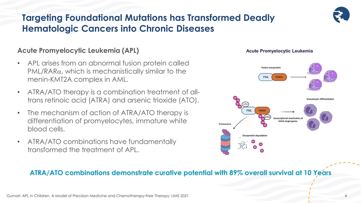 Targeting Foundational Mutations has Transformed Deadly Hematologic Cancers into Chronic Diseases Acute Promyelocytic Leukemia Acute Promyelocytic Leukemia (APL) • APL arises from an abnormal fusion protein called PML/RARα, which is mechanistically similar to the menin-KMT2A complex in AML. • ATRA/ATO therapy is a combination treatment of all- trans retinoic acid (ATRA) and arsenic trioxide (ATO). • The mechanism of action of ATRA/ATO therapy is differentiation of promyelocytes, immature white blood cells. • ATRA/ATO combinations have fundamentally transformed the treatment of APL. ATRA/ATO combinations demonstrate curative potential with 89% overall survival at 10 Years Gurnari: APL in Children, A Model of Precision Medicine and Chemotherapy-Free Therapy: IJMS 2021 4