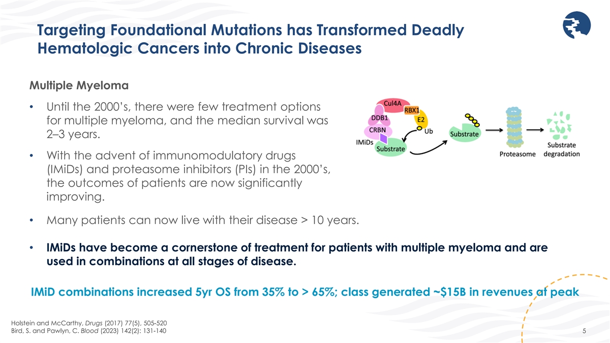 Targeting Foundational Mutations has Transformed Deadly Hematologic Cancers into Chronic Diseases Multiple Myeloma • Until the 2000’s, there were few treatment options for multiple myeloma, and the median survival was 2–3 years. • With the advent of immunomodulatory drugs (IMiDs) and proteasome inhibitors (PIs) in the 2000’s, the outcomes of patients are now significantly improving. • Many patients can now live with their disease > 10 years. • IMiDs have become a cornerstone of treatment for patients with multiple myeloma and are used in combinations at all stages of disease. IMiD combinations increased 5yr OS from 35% to > 65%; class generated ~$15B in revenues at peak Holstein and McCarthy, Drugs (2017) 77(5), 505-520 Bird, S. and Pawlyn, C. Blood (2023) 142(2): 131-140 5