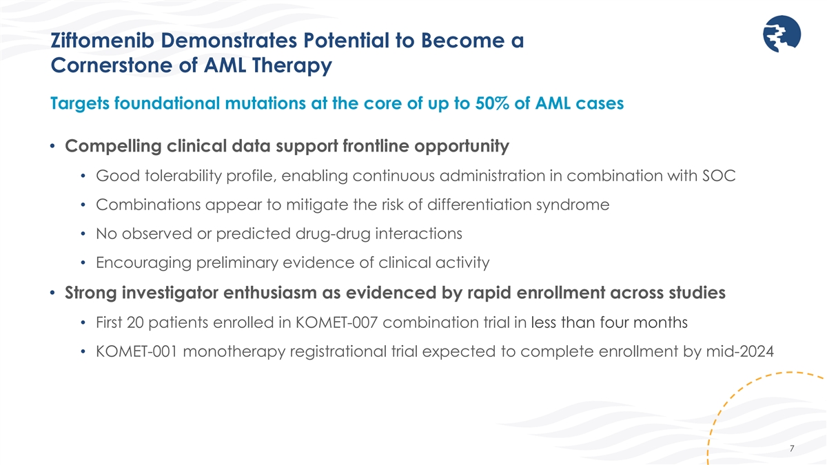 Ziftomenib Demonstrates Potential to Become a Cornerstone of AML Therapy Targets foundational mutations at the core of up to 50% of AML cases • Compelling clinical data support frontline opportunity • Good tolerability profile, enabling continuous administration in combination with SOC • Combinations appear to mitigate the risk of differentiation syndrome • No observed or predicted drug-drug interactions • Encouraging preliminary evidence of clinical activity • Strong investigator enthusiasm as evidenced by rapid enrollment across studies • First 20 patients enrolled in KOMET-007 combination trial in less than four months • KOMET-001 monotherapy registrational trial expected to complete enrollment by mid-2024 7