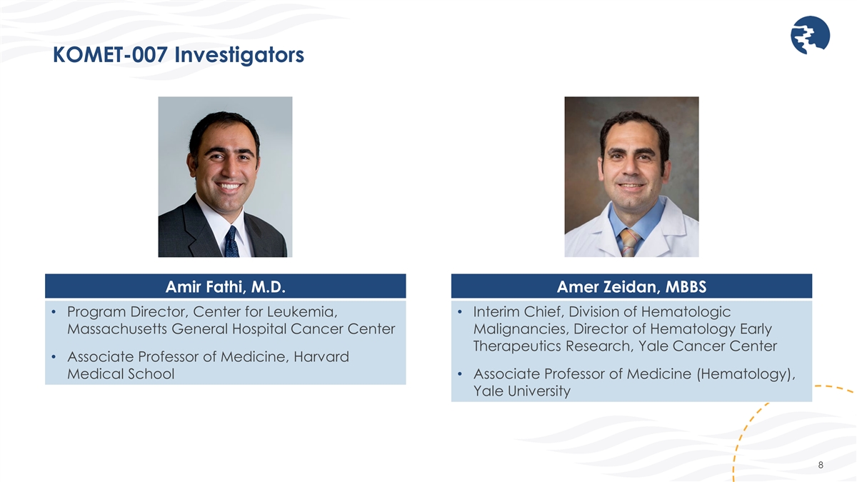 KOMET-007 Investigators Amir Fathi, M.D. Amer Zeidan, MBBS • Program Director, Center for Leukemia, • Interim Chief, Division of Hematologic Massachusetts General Hospital Cancer Center Malignancies, Director of Hematology Early Therapeutics Research, Yale Cancer Center • Associate Professor of Medicine, Harvard Medical School • Associate Professor of Medicine (Hematology), Yale University 8