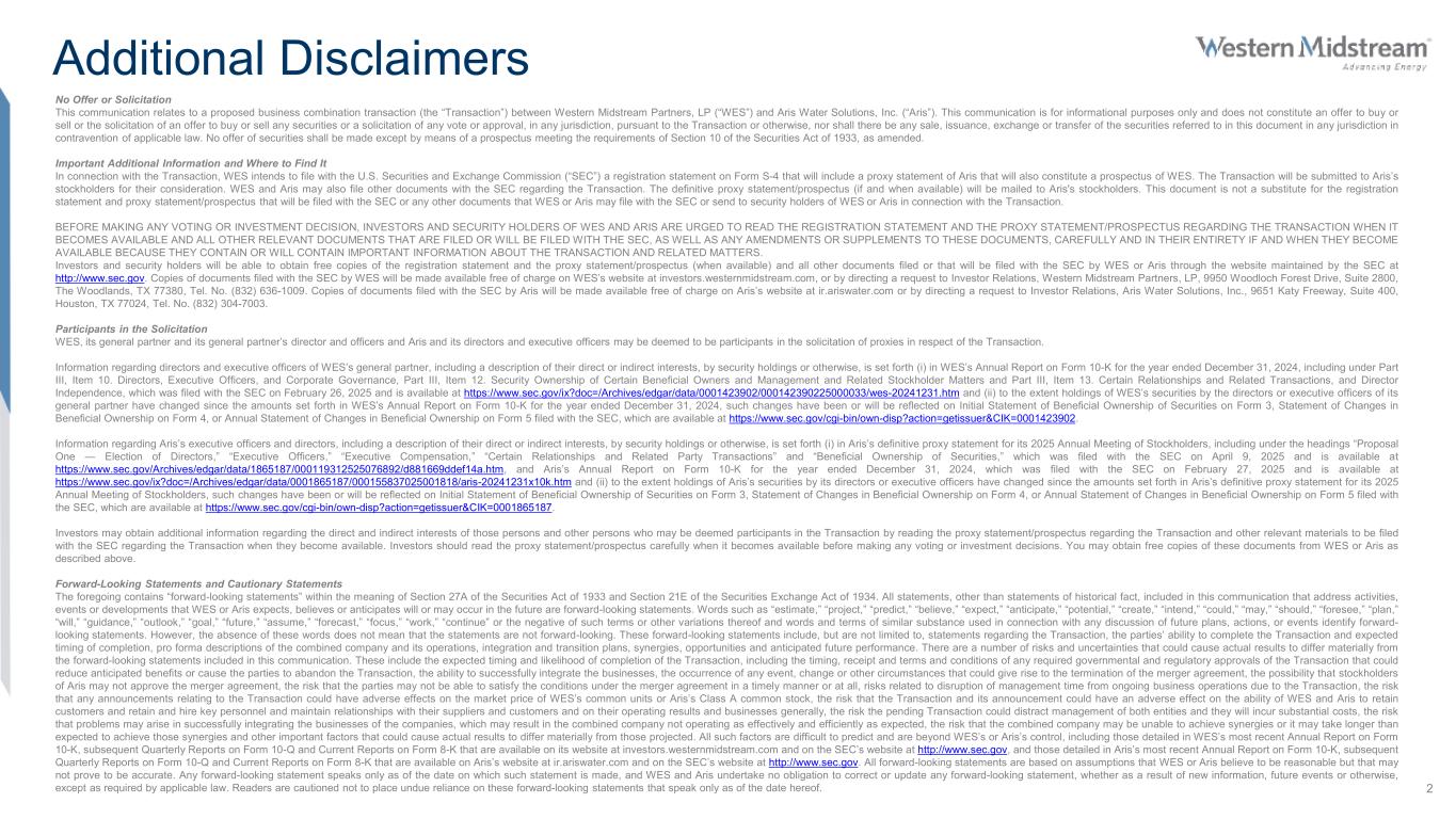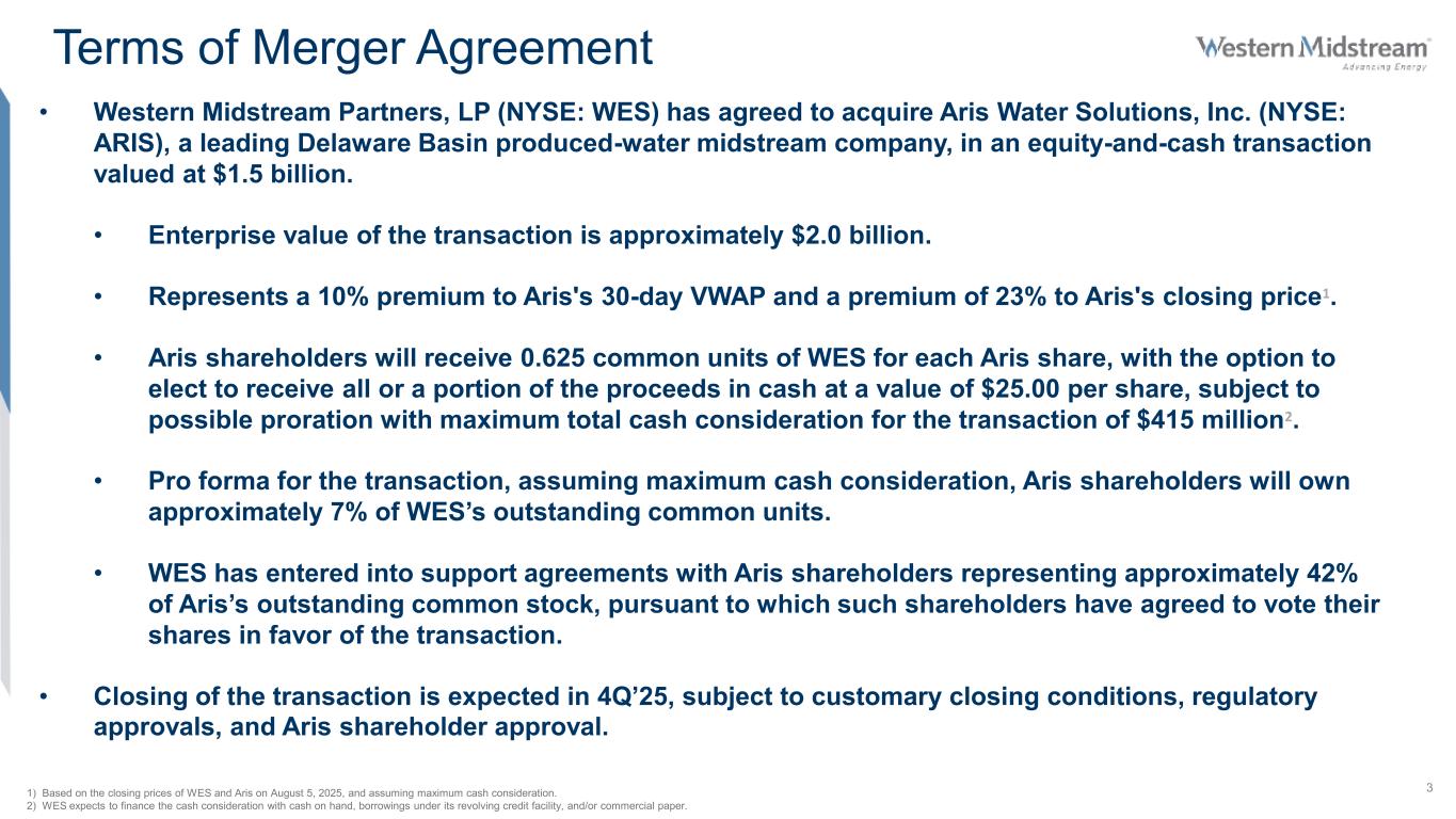 2 No Offer or Solicitation This communication relates to a proposed business combination transaction (the “Transaction”) between Western Midstream Partners, LP (“WES”) and Aris Water Solutions, Inc. (“Aris”). This communication is for informational purposes only and does not constitute an offer to buy or sell or the solicitation of an offer to buy or sell any securities or a solicitation of any vote or approval, in any jurisdiction, pursuant to the Transaction or otherwise, nor shall there be any sale, issuance, exchange or transfer of the securities referred to in this document in any jurisdiction in contravention of applicable law. No offer of securities shall be made except by means of a prospectus meeting the requirements of Section 10 of the Securities Act of 1933, as amended. Important Additional Information and Where to Find It In connection with the Transaction, WES intends to file with the U.S. Securities and Exchange Commission (“SEC”) a registration statement on Form S-4 that will include a proxy statement of Aris that will also constitute a prospectus of WES. The Transaction will be submitted to Aris’s stockholders for their consideration. WES and Aris may also file other documents with the SEC regarding the Transaction. The definitive proxy statement/prospectus (if and when available) will be mailed to Aris's stockholders. This document is not a substitute for the registration statement and proxy statement/prospectus that will be filed with the SEC or any other documents that WES or Aris may file with the SEC or send to security holders of WES or Aris in connection with the Transaction. BEFORE MAKING ANY VOTING OR INVESTMENT DECISION, INVESTORS AND SECURITY HOLDERS OF WES AND ARIS ARE URGED TO READ THE REGISTRATION STATEMENT AND THE PROXY STATEMENT/PROSPECTUS REGARDING THE TRANSACTION WHEN IT BECOMES AVAILABLE AND ALL OTHER RELEVANT DOCUMENTS THAT ARE FILED OR WILL BE FILED WITH THE SEC, AS WELL AS ANY AMENDMENTS OR SUPPLEMENTS TO THESE DOCUMENTS, CAREFULLY AND IN THEIR ENTIRETY IF AND WHEN THEY BECOME AVAILABLE BECAUSE THEY CONTAIN OR WILL CONTAIN IMPORTANT INFORMATION ABOUT THE TRANSACTION AND RELATED MATTERS. Investors and security holders will be able to obtain free copies of the registration statement and the proxy statement/prospectus (when available) and all other documents filed or that will be filed with the SEC by WES or Aris through the website maintained by the SEC at http://www.sec.gov. Copies of documents filed with the SEC by WES will be made available free of charge on WES’s website at investors.westernmidstream.com, or by directing a request to Investor Relations, Western Midstream Partners, LP, 9950 Woodloch Forest Drive, Suite 2800, The Woodlands, TX 77380, Tel. No. (832) 636-1009. Copies of documents filed with the SEC by Aris will be made available free of charge on Aris’s website at ir.ariswater.com or by directing a request to Investor Relations, Aris Water Solutions, Inc., 9651 Katy Freeway, Suite 400, Houston, TX 77024, Tel. No. (832) 304-7003. Participants in the Solicitation WES, its general partner and its general partner’s director and officers and Aris and its directors and executive officers may be deemed to be participants in the solicitation of proxies in respect of the Transaction. Information regarding directors and executive officers of WES’s general partner, including a description of their direct or indirect interests, by security holdings or otherwise, is set forth (i) in WES’s Annual Report on Form 10-K for the year ended December 31, 2024, including under Part III, Item 10. Directors, Executive Officers, and Corporate Governance, Part III, Item 12. Security Ownership of Certain Beneficial Owners and Management and Related Stockholder Matters and Part III, Item 13. Certain Relationships and Related Transactions, and Director Independence, which was filed with the SEC on February 26, 2025 and is available at https://www.sec.gov/ix?doc=/Archives/edgar/data/0001423902/000142390225000033/wes-20241231.htm and (ii) to the extent holdings of WES’s securities by the directors or executive officers of its general partner have changed since the amounts set forth in WES’s Annual Report on Form 10-K for the year ended December 31, 2024, such changes have been or will be reflected on Initial Statement of Beneficial Ownership of Securities on Form 3, Statement of Changes in Beneficial Ownership on Form 4, or Annual Statement of Changes in Beneficial Ownership on Form 5 filed with the SEC, which are available at https://www.sec.gov/cgi-bin/own-disp?action=getissuer&CIK=0001423902. Information regarding Aris’s executive officers and directors, including a description of their direct or indirect interests, by security holdings or otherwise, is set forth (i) in Aris’s definitive proxy statement for its 2025 Annual Meeting of Stockholders, including under the headings “Proposal One — Election of Directors,” “Executive Officers,” “Executive Compensation,” “Certain Relationships and Related Party Transactions” and “Beneficial Ownership of Securities,” which was filed with the SEC on April 9, 2025 and is available at https://www.sec.gov/Archives/edgar/data/1865187/000119312525076892/d881669ddef14a.htm, and Aris’s Annual Report on Form 10-K for the year ended December 31, 2024, which was filed with the SEC on February 27, 2025 and is available at https://www.sec.gov/ix?doc=/Archives/edgar/data/0001865187/000155837025001818/aris-20241231x10k.htm and (ii) to the extent holdings of Aris’s securities by its directors or executive officers have changed since the amounts set forth in Aris’s definitive proxy statement for its 2025 Annual Meeting of Stockholders, such changes have been or will be reflected on Initial Statement of Beneficial Ownership of Securities on Form 3, Statement of Changes in Beneficial Ownership on Form 4, or Annual Statement of Changes in Beneficial Ownership on Form 5 filed wit