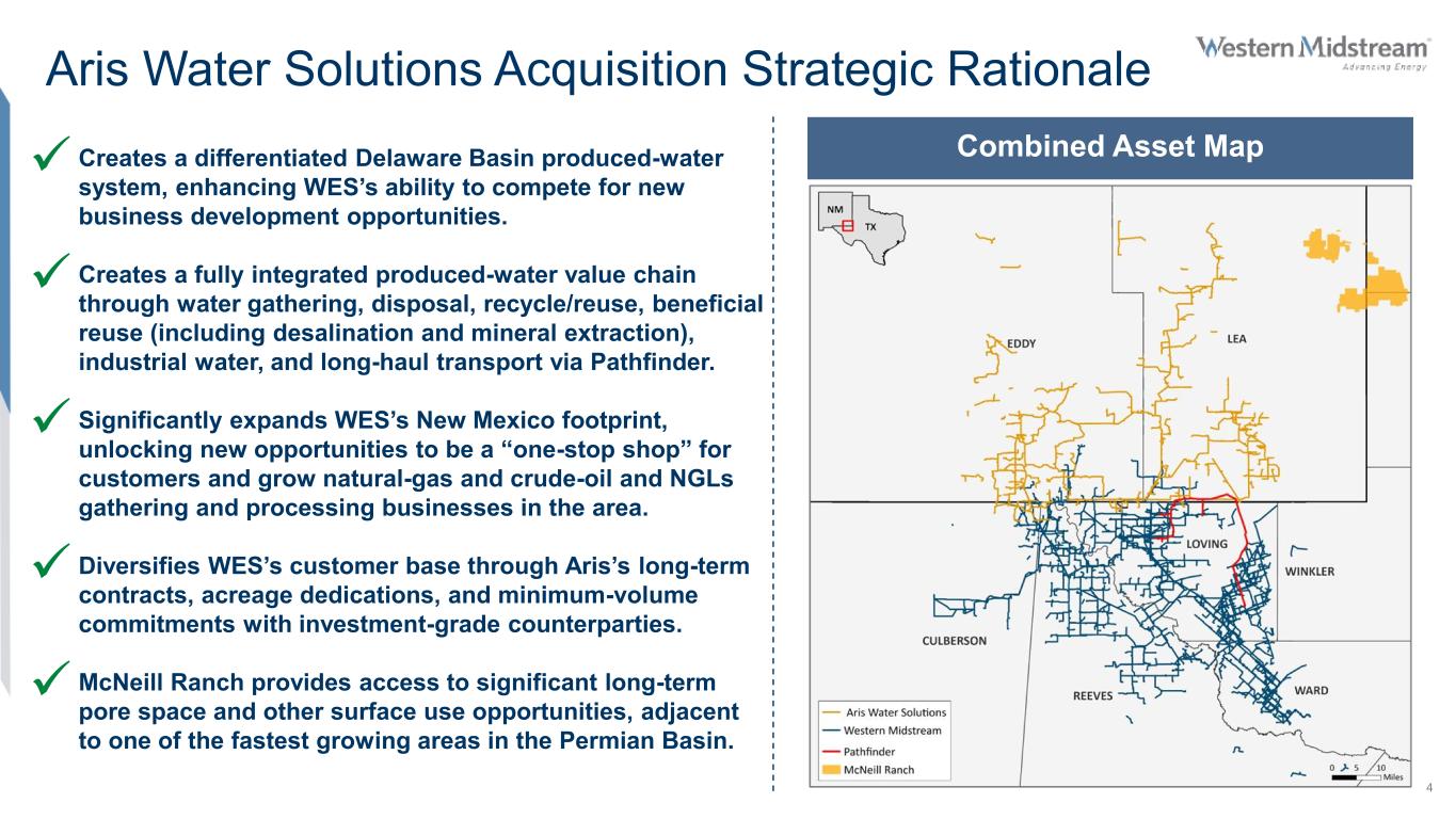 3 Terms of Merger Agreement • Western Midstream Partners, LP (NYSE: WES) has agreed to acquire Aris Water Solutions, Inc. (NYSE: ARIS), a leading Delaware Basin produced-water midstream company, in an equity-and-cash transaction valued at $1.5 billion. • Enterprise value of the transaction is approximately $2.0 billion. • Represents a 10% premium to Aris's 30-day VWAP and a premium of 23% to Aris's closing price1. • Aris shareholders will receive 0.625 common units of WES for each Aris share, with the option to elect to receive all or a portion of the proceeds in cash at a value of $25.00 per share, subject to possible proration with maximum total cash consideration for the transaction of $415 million2. • Pro forma for the transaction, assuming maximum cash consideration, Aris shareholders will own approximately 7% of WES’s outstanding common units. • WES has entered into support agreements with Aris shareholders representing approximately 42% of Aris’s outstanding common stock, pursuant to which such shareholders have agreed to vote their shares in favor of the transaction. • Closing of the transaction is expected in 4Q’25, subject to customary closing conditions, regulatory approvals, and Aris shareholder approval. 1) Based on the closing prices of WES and Aris on August 5, 2025, and assuming maximum cash consideration. 2) WES expects to finance the cash consideration with cash on hand, borrowings under its revolving credit facility, and/or commercial paper.