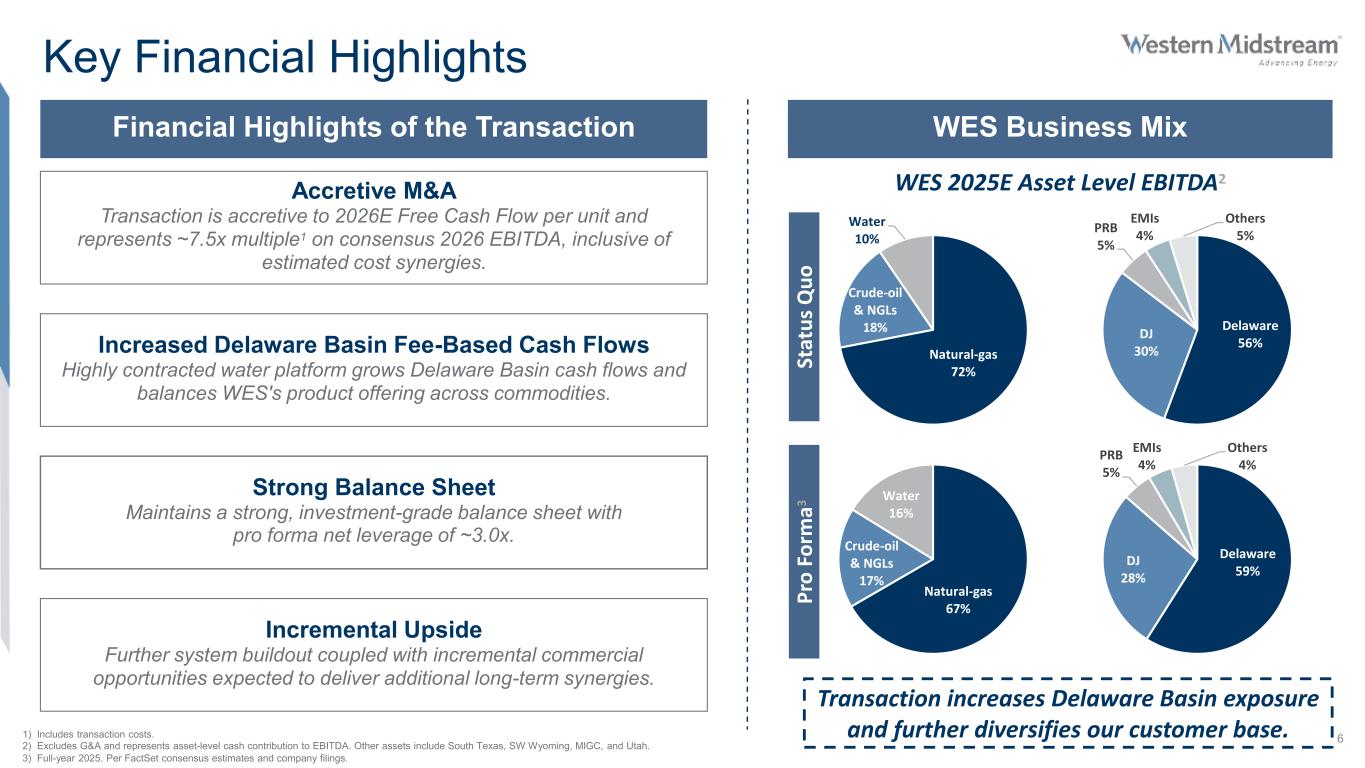 Natural-gas 67% Crude-oil & NGLs 17% Water 16% 6 Financial Highlights of the Transaction Strong Balance Sheet Maintains a strong, investment-grade balance sheet with pro forma net leverage of ~3.0x. Incremental Upside Further system buildout coupled with incremental commercial opportunities expected to deliver additional long-term synergies. Accretive M&A Transaction is accretive to 2026E Free Cash Flow per unit and represents ~7.5x multiple1 on consensus 2026 EBITDA, inclusive of estimated cost synergies. WES Business Mix Key Financial Highlights Increased Delaware Basin Fee-Based Cash Flows Highly contracted water platform grows Delaware Basin cash flows and balances WES's product offering across commodities. St at u s Q u o P ro F o rm a3 Delaware 59% DJ 28% PRB 5% EMIs 4% Others 4% Delaware 56% DJ 30% PRB 5% EMIs 4% Others 5% Transaction increases Delaware Basin exposure and further diversifies our customer base. WES 2025E Asset Level EBITDA2 Natural-gas 72% Crude-oil & NGLs 18% Water 10% 1) Includes transaction costs. 2) Excludes G&A and represents asset-level cash contribution to EBITDA. Other assets include South Texas, SW Wyoming, MIGC, and Utah. 3) Full-year 2025. Per FactSet consensus estimates and company filings.