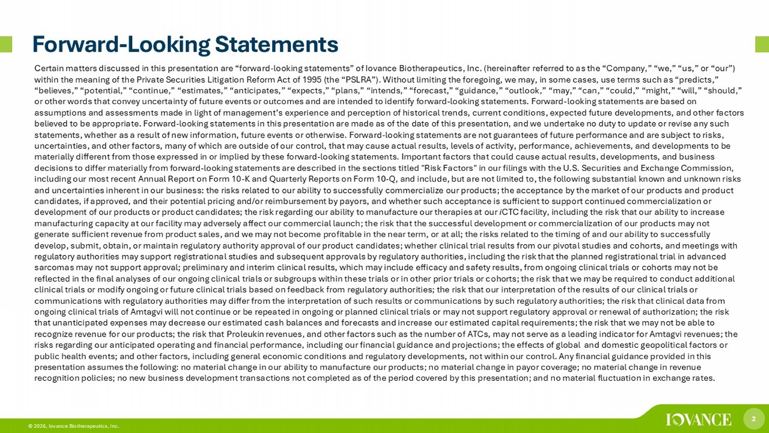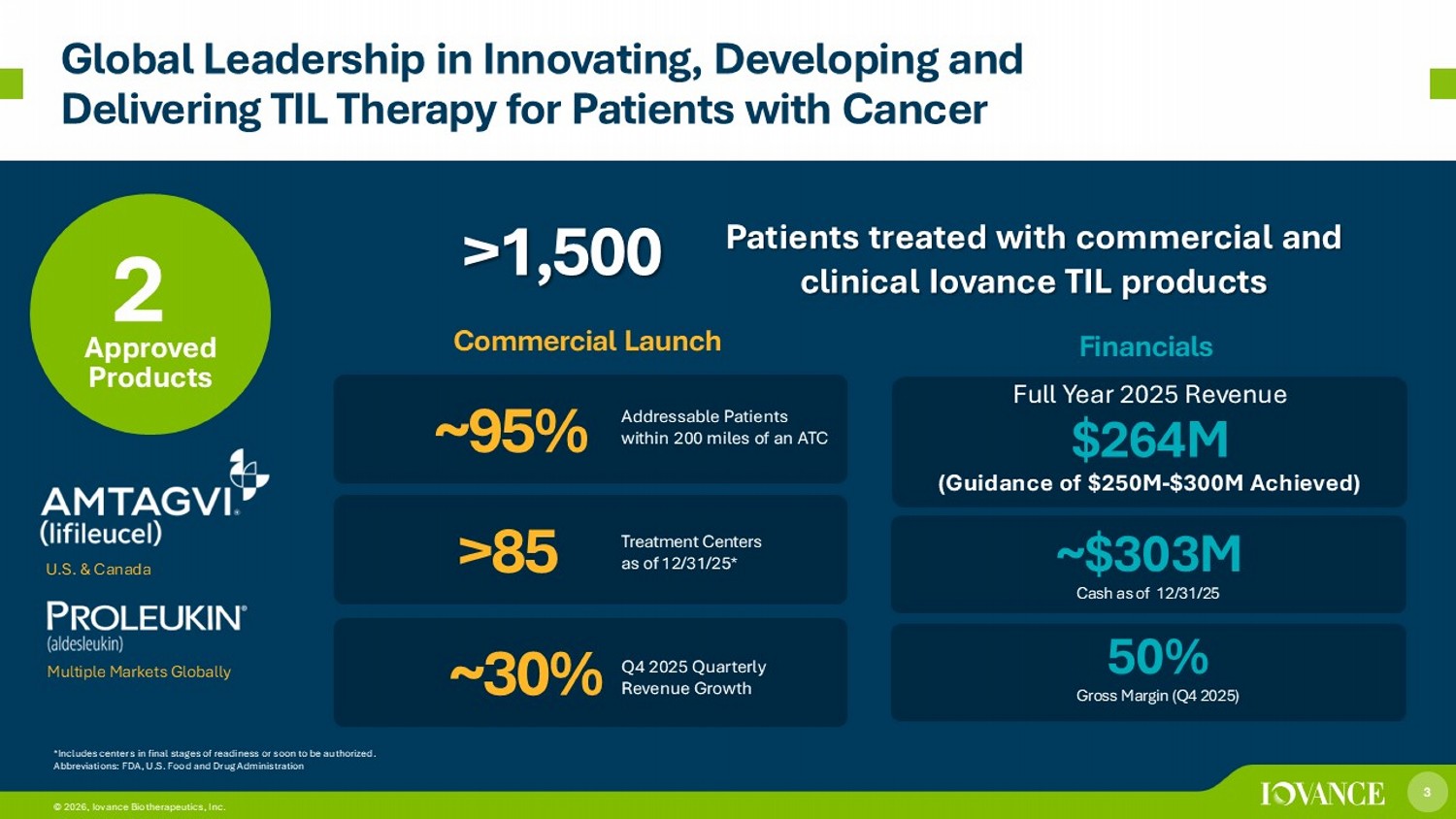 2 © 2026, Iovance Biotherapeutics, Inc. Forward - Looking Statements Certain matters discussed in this presentation are “forward - looking statements” of Iovance Biotherapeutics, Inc. (hereinafter referred to as the “Company,” “we,” “us,” or “our”) within the meaning of the Private Securities Litigation Reform Act of 1995 (the “PSLRA”). Without limiting the foregoing, we may , in some cases, use terms such as “predicts,” “believes,” “potential,” “continue,” “estimates,” “anticipates,” “expects,” “plans,” “intends,” “forecast,” “guidance,” “outl ook ,” “may,” “can,” “could,” “might,” “will,” “should,” or other words that convey uncertainty of future events or outcomes and are intended to identify forward - looking statements. For ward - looking statements are based on assumptions and assessments made in light of management’s experience and perception of historical trends, current conditions, ex pected future developments, and other factors believed to be appropriate. Forward - looking statements in this presentation are made as of the date of this presentation, and we undertake no duty to update or revise any such statements, whether as a result of new information, future events or otherwise. Forward - looking statements are not guarantees of future performance and are subject to risks, uncertainties, and other factors, many of which are outside of our control, that may cause actual results, levels of activity , p erformance, achievements, and developments to be materially different from those expressed in or implied by these forward - looking statements. Important factors that could cause actual results, developments, and business decisions to differ materially from forward - looking statements are described in the sections titled "Risk Factors" in our filing s with the U.S. Securities and Exchange Commission, including our most recent Annual Report on Form 10 - K and Quarterly Reports on Form 10 - Q, and include, but are not limited to, th e following substantial known and unknown risks and uncertainties inherent in our business: the risks related to our ability to successfully commercialize our products; the acc eptance by the market of our products and product candidates, if approved, and their potential pricing and/or reimbursement by payors, and whether such acceptance is sufficient t o support continued commercialization or development of our products or product candidates; the risk regarding our ability to manufacture our therapies at our i CTC facility, including the risk that our ability to increase manufacturing capacity at our facility may adversely affect our commercial launch; the risk that the successful development o r c ommercialization of our products may not generate sufficient revenue from product sales, and we may not become profitable in the near term, or at all; the risks relat ed to the timing of and our ability to successfully develop, submit, obtain, or maintain regulatory authority approval of our product candidates; whether clinical trial results fro m our pivotal studies and cohorts, and meetings with regulatory authorities may support registrational studies and subsequent approvals by regulatory authorities, including the r isk that the planned registrational trial in advanced sarcomas may not support approval; preliminary and interim clinical results, which may include efficacy and safety results, f rom ongoing clinical trials or cohorts may not be reflected in the final analyses of our ongoing clinical trials or subgroups within these trials or in other prior trials or c oho rts; the risk that we may be required to conduct additional clinical trials or modify ongoing or future clinical trials based on feedback from regulatory authorities; the risk that our int erpretation of the results of our clinical trials or communications with regulatory authorities may differ from the interpretation of such results or communications by such regul ato ry authorities; the risk that clinical data from ongoing clinical trials of Amtagvi will not continue or be repeated in ongoing or planned clinical trials or may not support regulatory approval or renewal of a ut horization; the risk that unanticipated expenses may decrease our estimated cash balances and forecasts and increase our estimated capital require men ts; the risk that we may not be able to recognize revenue for our products; the risk that Proleukin revenues, and other factors such as the number of ATCs, may not serve as a leading indicator for Amtagvi revenues; the risks regarding our anticipated operating and financial performance, including our financial guidance and projections; the ef fec ts of global and domestic geopolitical factors or public health events; and other factors, including general economic conditions and regulatory developments, not within our co ntr ol. Any financial guidance provided in this presentation assumes the following: no material change in our ability to manufacture our products; no material change in payo r c overage; no material change in revenue recognition policies; no new business development transactions not completed as of the period covered by this presentation; a nd no material fluctuation in exchange rates.
