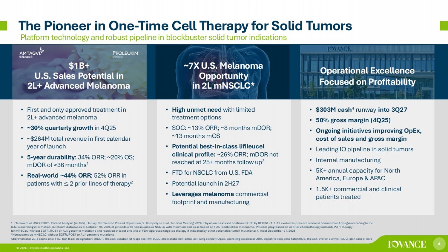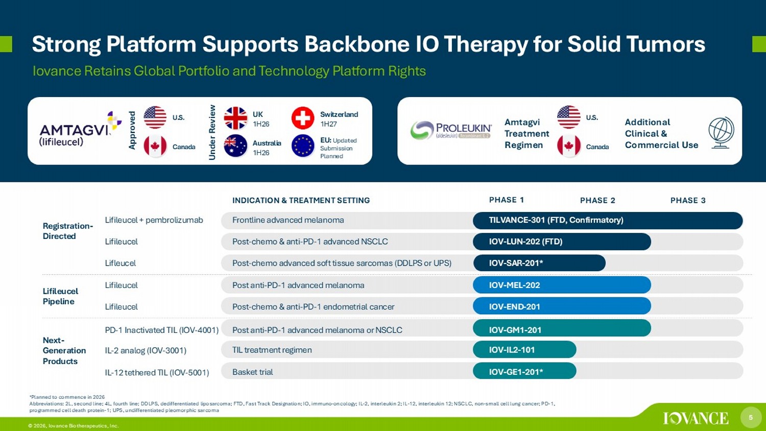 4 © 2026, Iovance Biotherapeutics, Inc. The Pioneer in One - Time Cell Therapy for Solid Tumors 4 4 © 2026, Iovance Biotherapeutics, Inc. 1. Medina et al, ASCO 2025. Pooled Analysis (n=153), Heavily Pre - Treated Patient Population; 2. Karapetyan et al, Tandem Meeting 2026. Physician - assessed confirmed ORR by RECIST v1.1. All evaluable patients received commercial Amtagvi according to the U.S. prescribing information; 3. Interim data cut as of October 10, 2025 of patients with nonsquamous NSCLC with minimum cell dose based on FDA feedback for melnaoma . Patients progressed on or after chemotherapy and anti - PD - 1 therapy for mNSCLC without EGFR, ROS1 or ALK genomic mutations and received at least one line of FDA - approved targeted therapy if indica ted by other actionable tumor mutations; 4. As of December 31 , 2025 *Nonsquamous mNSCLC without EGFR, ROS1 or ALK genomic mutations Abbreviations: 2L, second line; FTD, fast track designation; mDOR, median duration of response; mNSCLC, metastatic non - small cel l lung cancer; OpEx , operating expenses; ORR, objective response rate; mOS, median overall survival; SOC, standard of care Platform technology and robust pipeline in blockbuster solid tumor indications Operational Excellence Focused on Profitability ~7X U.S. Melanoma Opportunity in 2L mNSCLC* $1B+ U.S. Sales Potential in 2L+ Advanced Melanoma • $303M cash 4 runway into 3Q27 • 50% gross margin (4Q25) • Ongoing initiatives improving OpEx , cost of sales and gross margin • Leading IO pipeline in solid tumors • Internal manufacturing • 5K+ annual capacity for North America, Europe & APAC • 1.5K+ commercial and clinical patients treated • High unmet need with limited treatment options • SOC: ~13% ORR; ~8 months mDOR; ~13 months mOS • Potential best - in - class lifileucel clinical profile: ~26% ORR; mDOR not reached at 25+ months follow up 3 • FTD for NSCLC from U.S. FDA • Potential launch in 2H27 • Leverages melanoma commercial footprint and manufacturing • First and only approved treatment in 2L+ advanced melanoma • ~30% quarterly growth in 4Q25 • ~$264M total revenue in first calendar year of launch • 5 - year durability : 34% ORR; ~20% OS; mDOR of >36 months 1 • Real - world ~44% ORR ; 52% ORR in patients with ≤ 2 prior lines of therapy 2