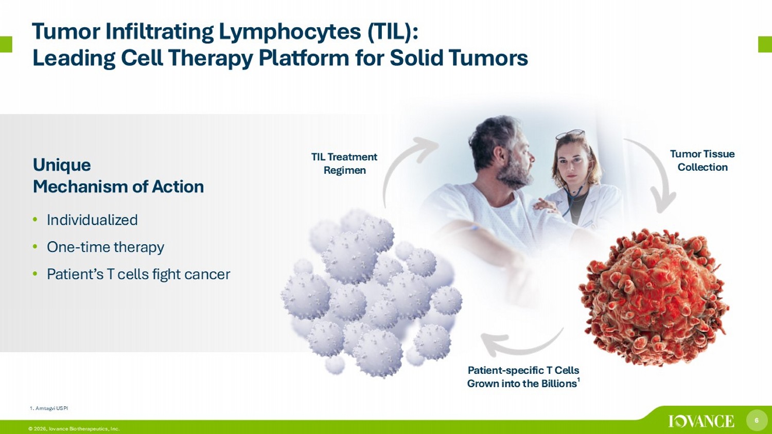 6 © 2026, Iovance Biotherapeutics, Inc. Tumor Infiltrating Lymphocytes (TIL): Leading Cell Therapy Platform for Solid Tumors Unique Mechanism of Action • Individualized • One - time therapy • Patient’s T cells fight cancer Tumor Tissue Collection Patient - specific T Cells Grown into the Billions 1 TIL Treatment Regimen 1. Amtagvi USPI