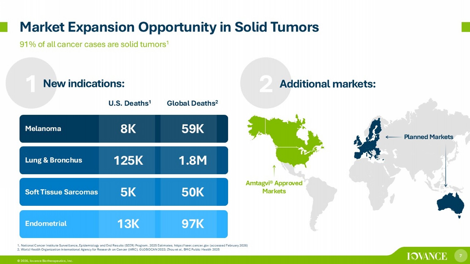 7 © 2026, Iovance Biotherapeutics, Inc. Global Deaths 2 U.S. Deaths 1 59K 8K Melanoma 1.8M 125K Lung & Bronchus 50K 5K Soft Tissue Sarcomas 97K 13K Endometrial 1. National Cancer Institute Surveillance, Epidemiology and End Results (SEER) Program. 2025 Estimates. https://seer.cancer.g ov (accessed February 2026) 2. World Health Organization International Agency for Research on Cancer (IARC). GLOBOCAN 2022; Zhou et al. BMC Public Health 20 25 91% of all cancer cases are solid tumors 1 Market Expansion Opportunity in Solid Tumors 1 New indications: 2 Additional markets: Amtagvi® Approved Markets Planned Markets