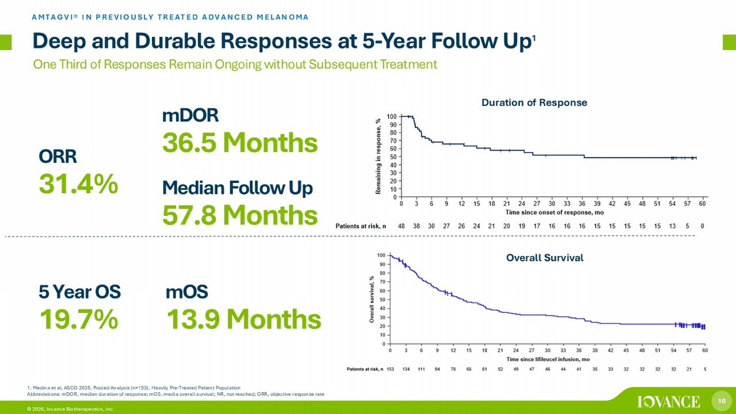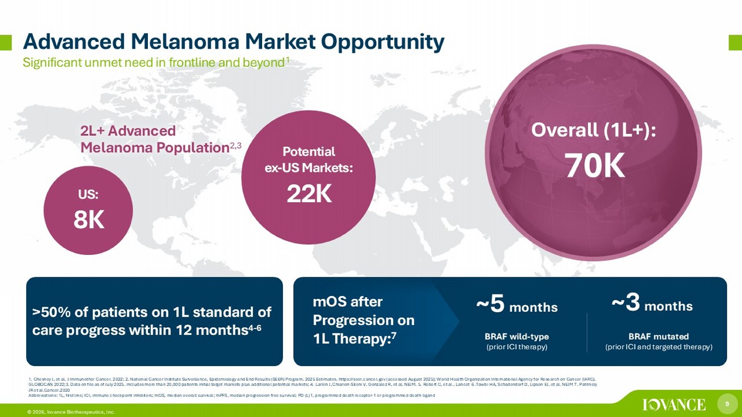 9 © 2026, Iovance Biotherapeutics, Inc. Significant unmet need in frontline and beyond 1 Advanced Melanoma Market Opportunity 2L+ Advanced Melanoma Population 2,3 US: 8K Potential ex - US Markets: 22 K Overall (1L+): 7 0K BRAF wild - type (prior ICI therapy ) ~ 5 months BRAF mutated (prior ICI and targeted therapy) ~ 3 months 1. Chesney J, et al. J Immunother Cancer. 2022; 2. National Cancer Institute Surveillance, Epidemiology and End Results (SEER) Program. 2025 Estimates. https:/ /s eer.cancer.gov (accessed August 2025); World Health Organization International Agency for Research on Cancer (IARC). GLOBOCAN 2022;3. Data on file as of July 2025. Includes more than 20,000 patients initial target markets plus additional pote nti al markets; 4. Larkin J, Chiarion - Sileni V, Gonzalez R, et al. NEJM. ​ 5. Robert C, et al.. Lancet 6. Tawbi HA, Schadendorf D, Lipson EJ, et al. NEJM 7. Patrinely JR et al.Cancer.2020 Abbreviations: 1L, first line; ICI, immune checkpoint inhibitors; mOS, median overall survival; mPFS, median progression - free su rvival; PD - (L)1, programmed death receptor - 1 or programmed death - ligand >50% of patients on 1L standard of care progress within 12 months 4 - 6 mOS after Progression on 1L Therapy: 7