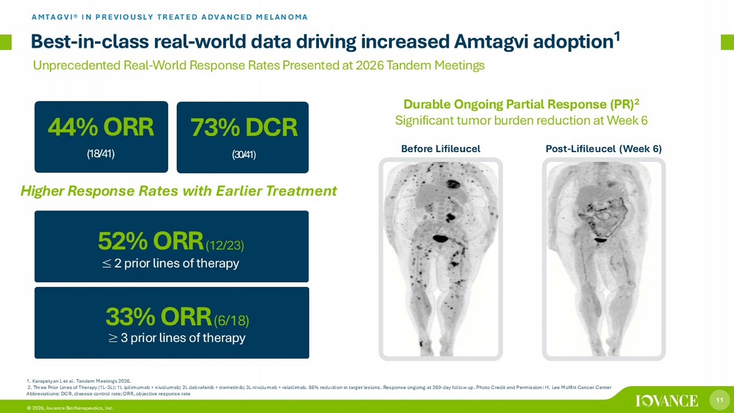 11 © 2026, Iovance Biotherapeutics, Inc. 52 % ORR (12/23) Best - in - class real - world data driving increased Amtagvi adoption 1 AMTAGVI® IN PREVIOUSLY TREATED ADVANCED MELANOMA 1. Karapetyan L et al. Tandem Meetings 2026. 2. Three Prior Lines of Therapy (1L - 3L): 1L ipilimumab + nivolumab; 2L dabrafenib + trametinib; 3L nivolumab + relatlimab. 86% reduction in target lesions. Response ongoing at 260 - day follow up. Photo Credit and Permission: H. Lee Moffitt Cancer Center Abbreviations: DCR, disease control rate; ORR, objective response rate 44 % ORR (18/41) 33% ORR (6/18) Before Lifileucel Post - Lifileucel (Week 6) Durable Ongoing Partial Response (PR) 2 Significant tumor burden reduction at Week 6 ≤ 2 prior lines of therapy ≥ 3 prior lines of therapy Unprecedented Real - World Response Rates Presented at 2026 Tandem Meetings 73% DCR ( 30/41) Higher Respon se Rates with Earlier Treatment