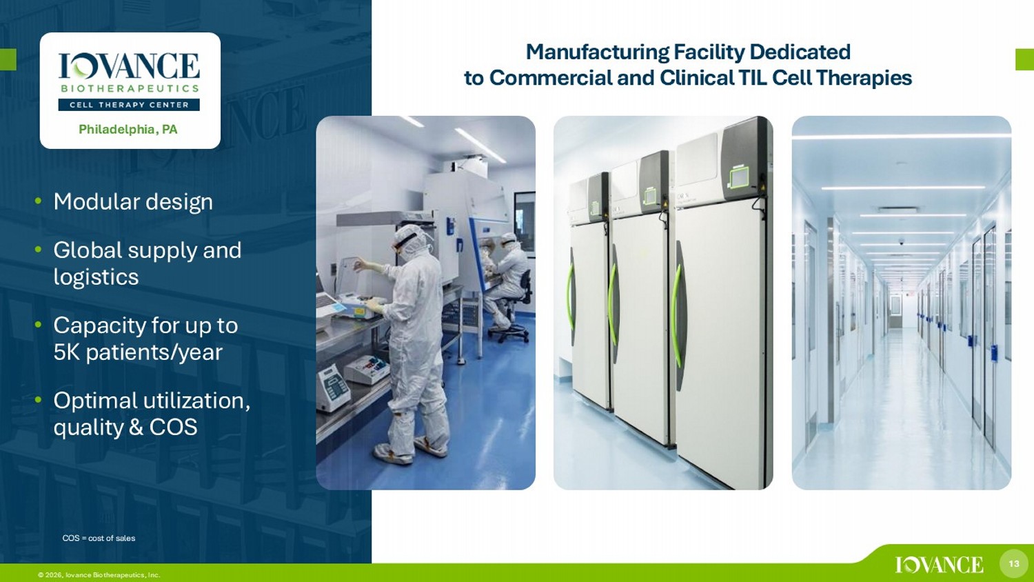 12 © 2026, Iovance Biotherapeutics, Inc. 12 © 2026, Iovance Biotherapeutics, Inc. Lymphodepletion Reimbursement ~3 Weeks Manufacturing, Release & Shipment Short - Course Proleukin® Scheduling Goal: <2 weeks Primary Oncologist ATC Medical Oncologist Follow - Up & Return to Primary Oncologist ~ 32 DAYS Community Practice Amtagvi® Patient Journey AMTAGVI® IN PREVIOUSLY TREATED ADVANCED MELANOMA Amtagvi® Broad payer coverage consistent with Amtagvi label, clinical trials and NCCN guidelines